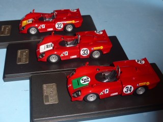 Arriva addirittura con un po’ di anticipo rispetto alla tabella di marcia l’Alfa Romeo 33/3 1969 di Madyero. Il modello colma una lacuna che si era formata ormai da molti anni nella storia delle 33 da competizione. Ricordiamo, a parte i kit dei primordi, il Project43-BBR e poi, agli inizi degli anni duemila, l’RS Model di Valerio Barnini, venduto solo montato nella versione numero 33 della 12 Ore di Sebring. Era quindi il momento di proporre qualcosa di più attuale e aggiornato. Ricordiamo che questa vettura fu quella del debutto della motorizzazione 3000cc, che avvenne in una gara tutt’altro che facile, appunto la 12 Ore della Florida. Le tre vetture non andarono molto lontano: Galli/Giunti/Casoni, con la numero 34, furono i primissimi dei settanta partenti a ritirarsi, per la perdita di una ruota dopo non aver percorso che un paio di giri; toccò poi alla numero 32 (Casoni/De Adamich/ Surtees) abbandonare dopo quindici tornate, a causa di un surriscaldamento, seguita a ruota dalla numero 33 (Vaccarella/Lucien Bianchi), vittima dello stesso problema. I guai di Sebring la dissero lunga sulla scarsa affidabilità della nuova 33/3, che durante la stagione subì diverse modifiche, dovendo spesso dichiarare forfait dopo che l’Autodelta aveva annunciato la propria partecipazione. La 33/3 migliorò molto nella stagione successiva ma questa è un’altra storia. Il modello Madyero, in resina con vari particolari in metallo bianco e fotoincisi, è stato realizzato con la consueta accuratezza dal marchio fiorentino, che ha in programma la realizzazione delle altre versioni del 1969.