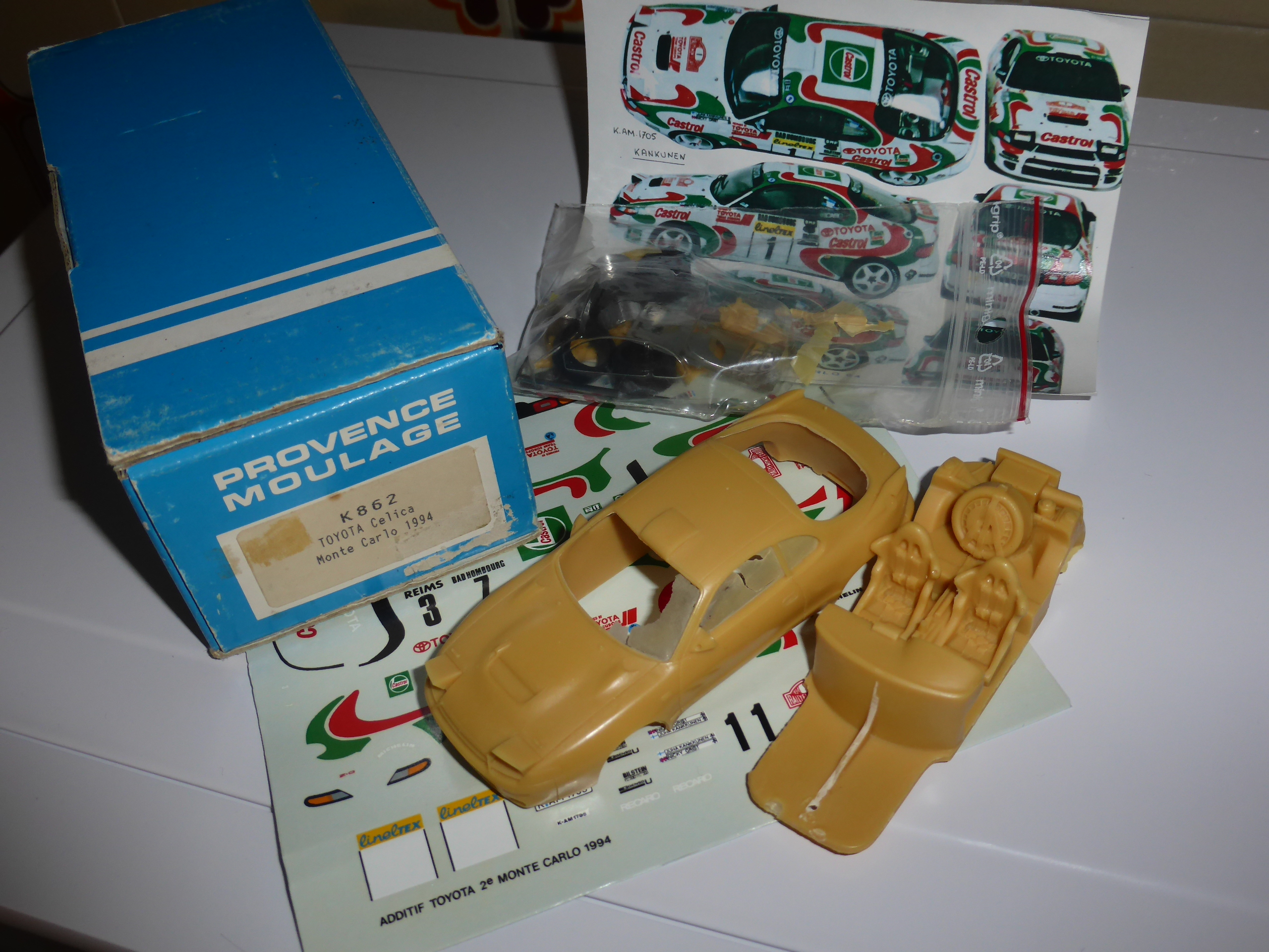 | Il kit della Toyota Celica GT-Four Rally Monte Carlo 1993-1994. Il master si deve a Cornu. Notare i tantissimi particolari già stampati col pianale: sedili, cinture, estintore, ruota di scorta con tanto di cinghia, e così via. Decals Virages. |