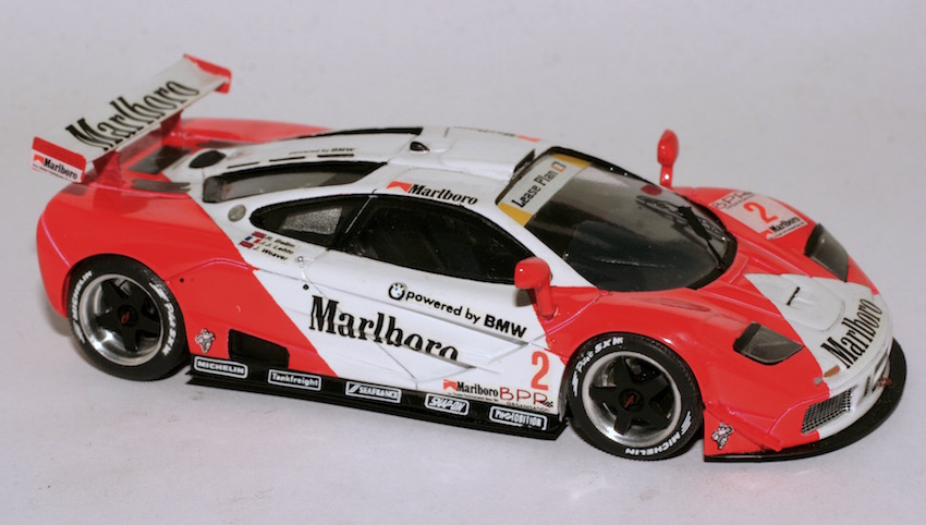 | McLaren F1 GTR. Se i loghi degli sponsor di tabacco non erano ancora proibiti ma in qualche modo tollerati, le case iniziarono a chiedere fior di soldoni per concedere la licenza di riproduzione. Iniziò una battaglia sotterranea, fatta di commerci \”confidenziali\” basati sulla fiducia reciproca fra produttore e commercianti. |
