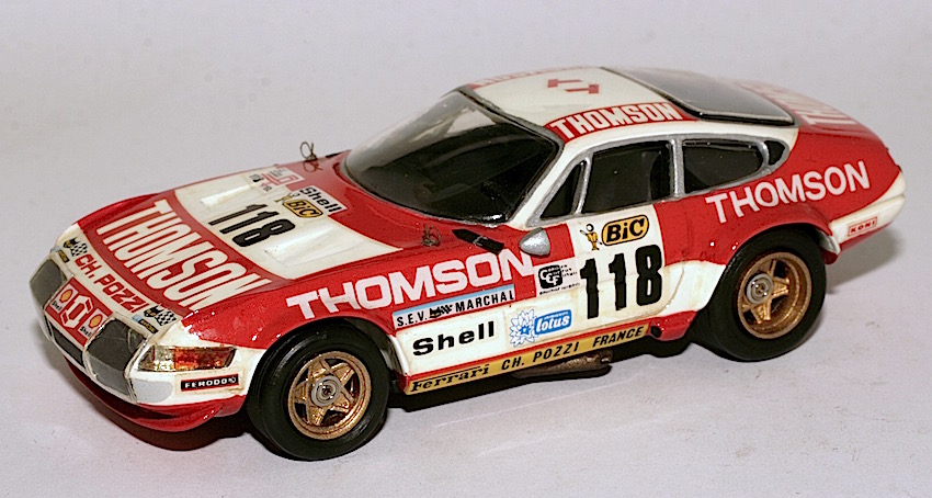 | Sopra: un esempio lampante. La Ferrari era già tra le più affamate in fatto di… lire. Provence Moulage per questa 512BB Bellancauto stampava un pianale anonimo, privo di ogni riferimento al marchio del Cavallino. Il mercato iniziava ad avvertire le prime ingerenze dei giganti dell\’automobile. Sotto: Ferrari Daytona Gr.4. In questo caso il master fu estrapolato da un prototipo iniziale creato da MRF. Uscirono molte versioni di questa gloriosa vettura, fra Tour Auto e, ovviamente, 24 Ore di Le Mans. |