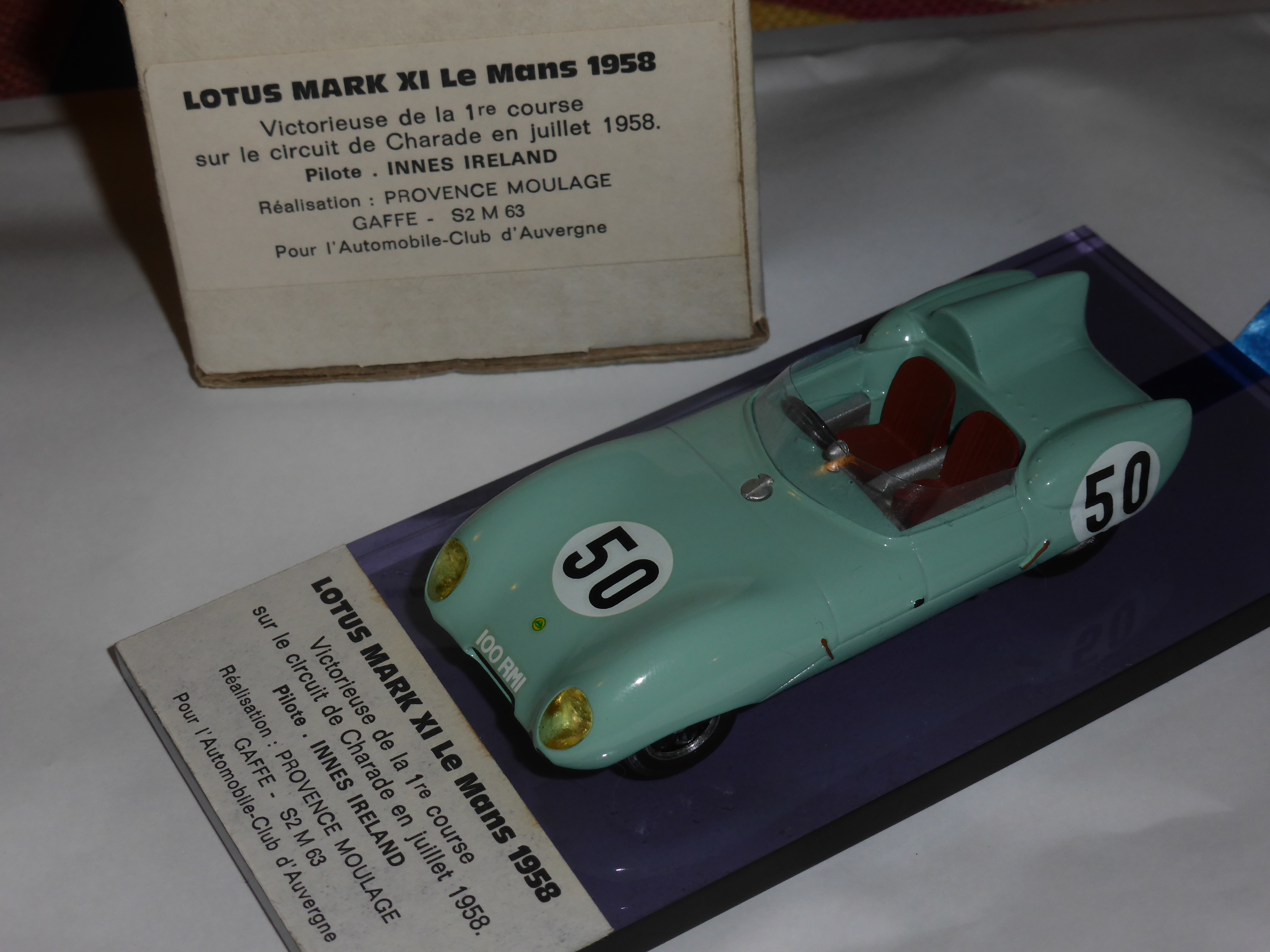 | Una rarità, che testimonia la molteplicità delle collaborazioni di Provence Moulage. Questa Lotus XI fu realizzata in serie limitata solo montata per l\’A.C. d\’Auvergne e celebrava la vittoria di Innes Ireland nella prima gara disputata a Charade, nel 1958. Il prototipo della Lotus XI era di Metroz. |