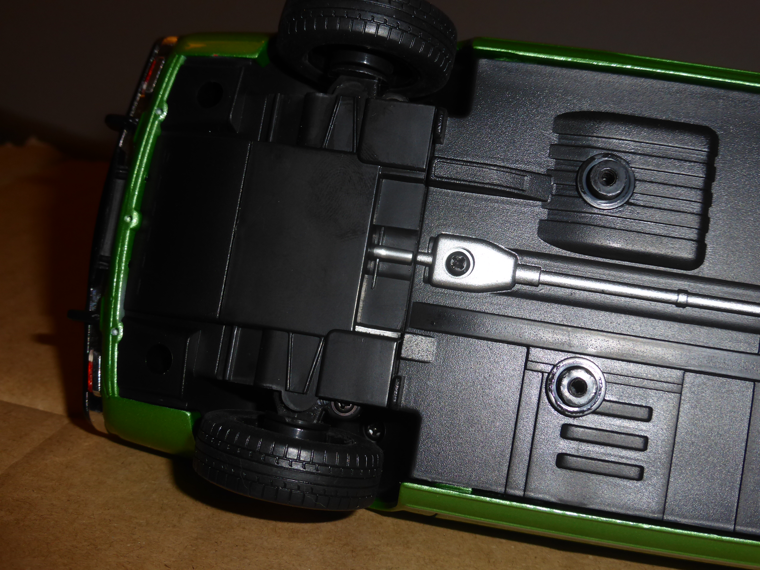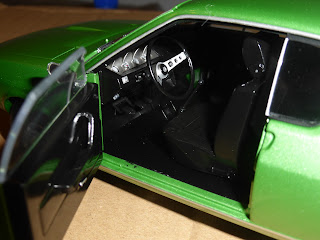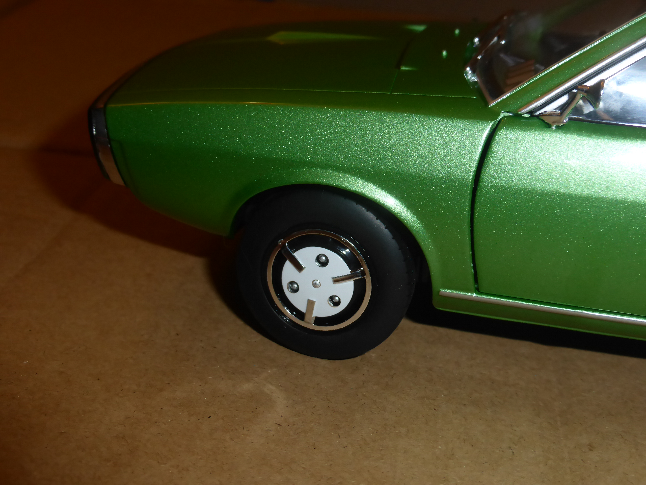 Belli i cerchi dal disegno tipico di quegli anni, accoppiati a gomme dalla scolpitura fedele e dalle misure giuste. Le portiere (le uniche aperture del modello) si azionano senza troppe difficoltà. Gli interni, in plastica nera, sono più che sufficienti, col futuristico cruscotto e il volante a due razze. Non cerchiamo le raffinatezze di certi Kyosho o anche, più semplicemente, di alcuni Norev, ma l\’essenziale, e anche qualcosa di più, c\’è.