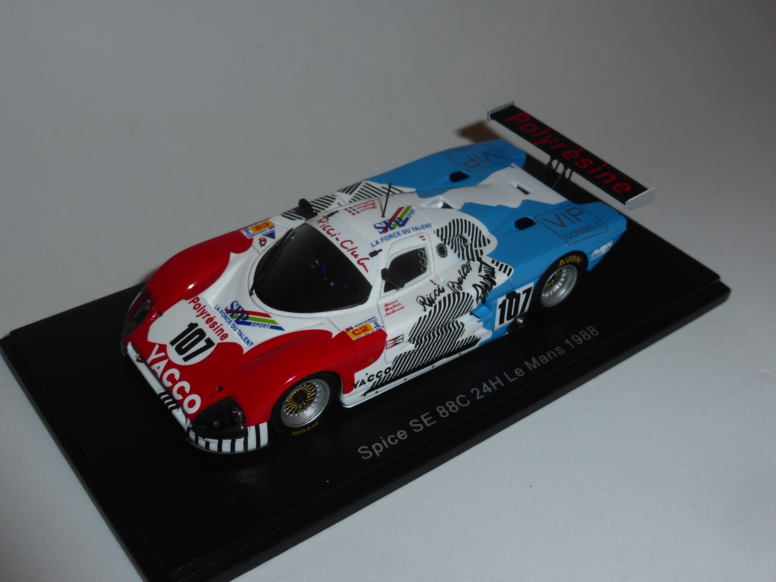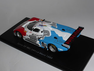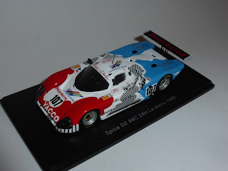 Volendo recensire qualche novità Spark avevo la possibilità di scegliere fra diversi soggetti, inclusa la Porsche 935 M16 IMSA di Daytona 1983 che su certi forum tipo Caradisiac è diventata quasi un mito tribale, al pari di quelle Corvette taroccate che sembrano ferri da stiro. Ho deciso di lasciar perdere anche perché già la mutanda di film trasparente sul tetto, a unire le due scritte dei piloti, mi aveva mal disposto. Escluse per il momento anche un paio di Porsche 911 GT1 private di Le Mans 1997 e la BMW M1 Marlboro di Le Mans 1980, ho optato stavolta per qualcosa di più conservativo anche se piuttosto originale, la Spice SE88C Gruppo C2 di Le Mans 1988. Non che la vettura sia inedita, visto che Spark ha già riprodotto le due auto ufficiali, ma mi pareva un qualcosa in linea con un certo spirito cui la casa di Ripert ci ha abituato negli anni. Insomma, posso dire già da ora che questo modello sa di speciale ben montato, come se ci si trovasse davanti un Automany, uno Starter o un Provence Moulage fatto come si deve ai tempi dei tempi.
