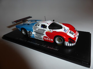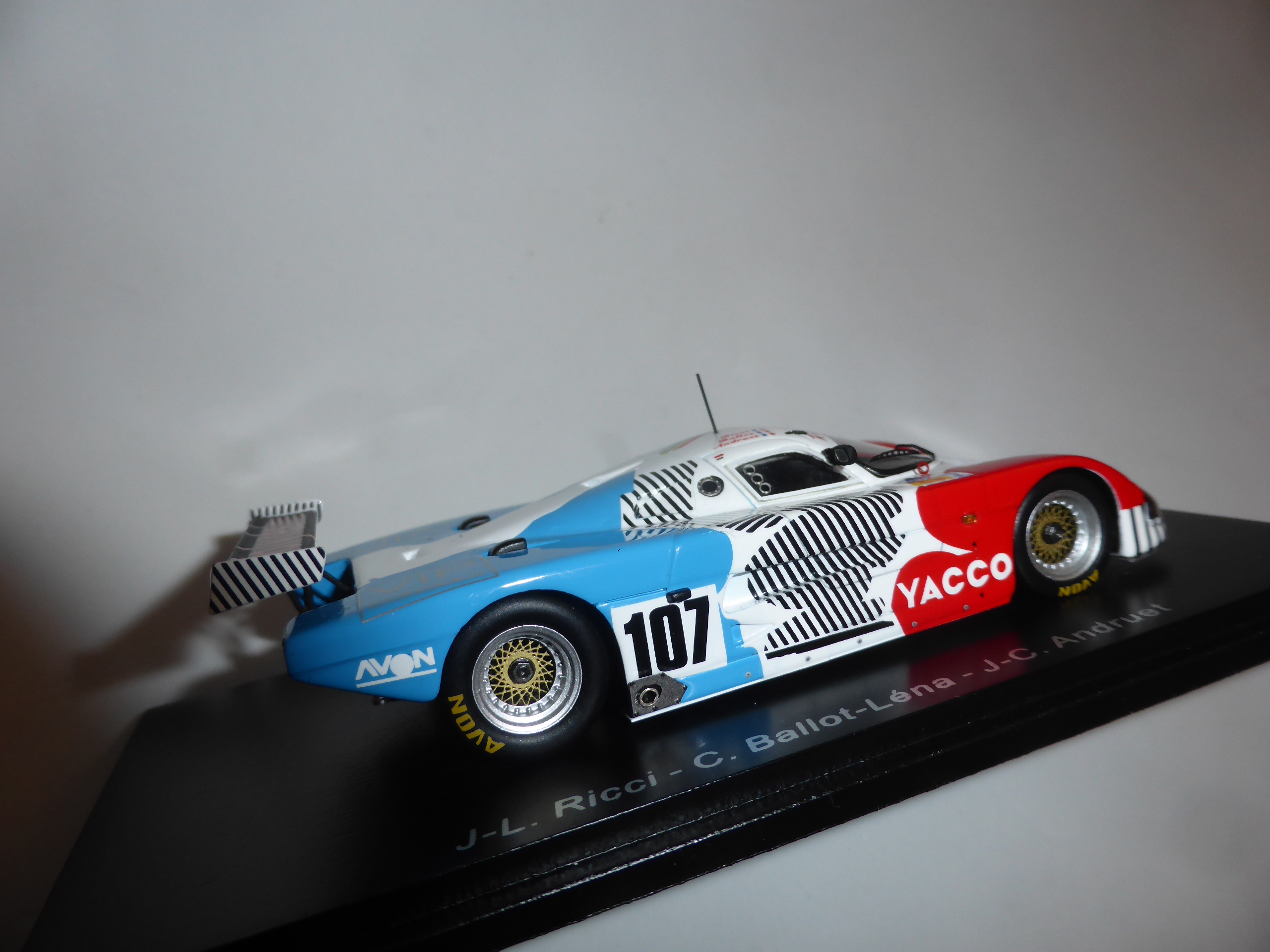 Il regolamento in vigore dal 1988 prevedeva inoltre un fondo più ampio e una riduzione dell\’efficienza aerodinamica con l\’abbassamento dei tunnel venturi. La SE88, con l\’aerodinamica progettata dalla Humphrys, fu sviluppata nella galleria del vento dell\’università di Southampton. Rispetto alla SE87 la sezione del frontale venne ridotta per portare più aria fino all\’ala posteriore a sbalzo. Fu potenziato anche l\’impianto frenante AP. Spark ha fatto un gran lavoro per riprodurre al meglio la complessa livrea tricolore della vettura numero 107 di Le Mans 1988, pilotata da Jean-Louis Ricci, Jean-Claude Andruet e Claude Ballot-Lena: un trio di piloti di grande esperienza, che non restò però a lungo in pista. La verniciatura è a tre colori, ma decals bianche sono state utilizzate per riprodurre le varie chiazze irregolari che debordano sul blu e sul rosso. Come Spark riesca ad applicare decals con questa precisione (e con questo potere coprente) è e rimane un mistero.