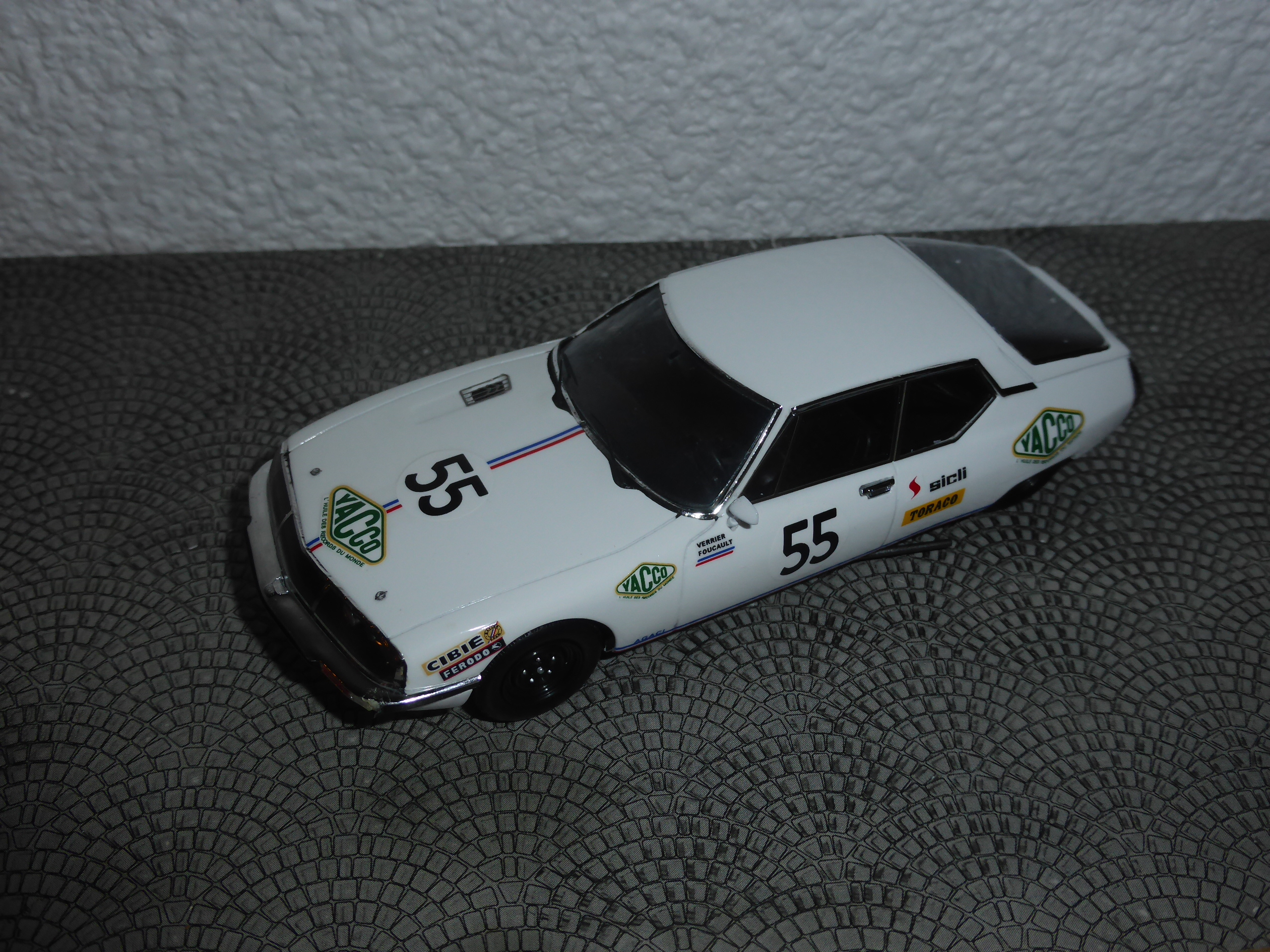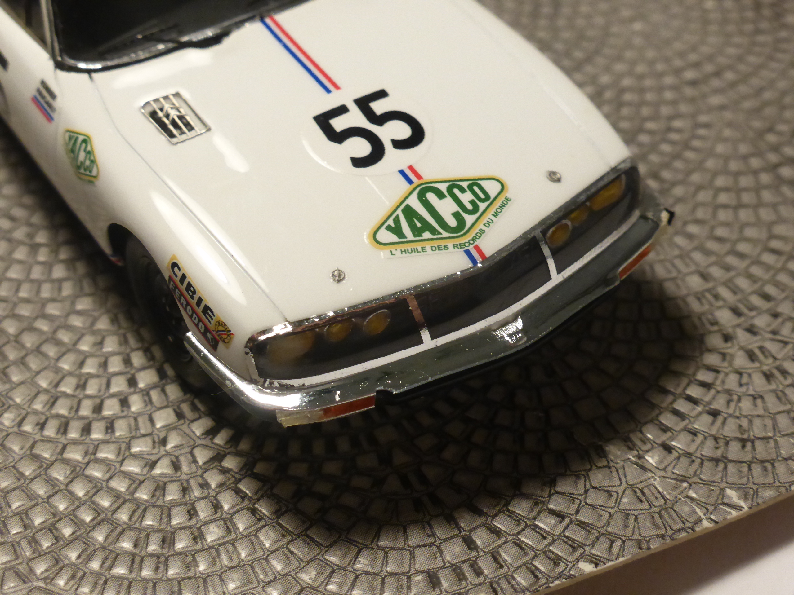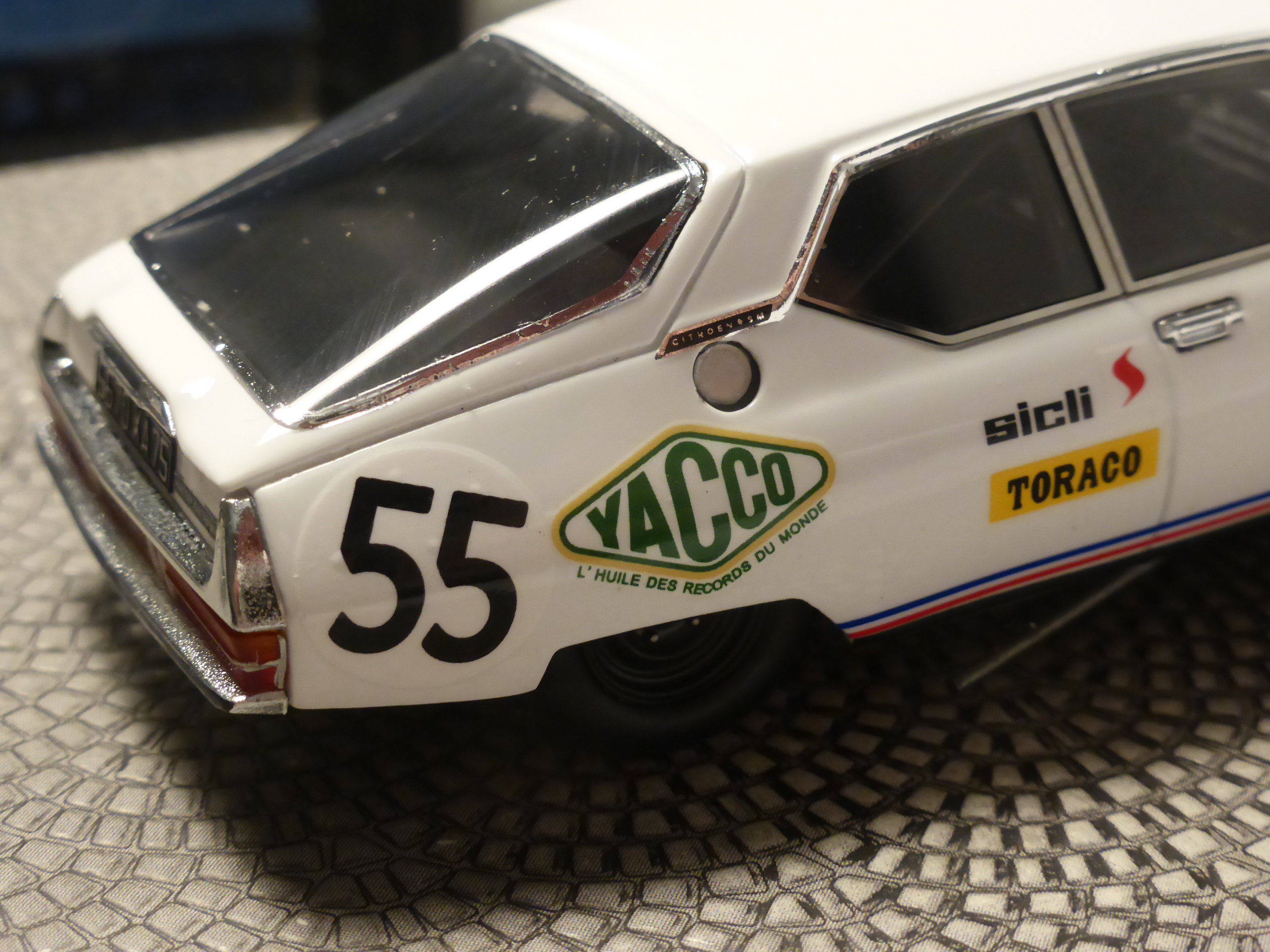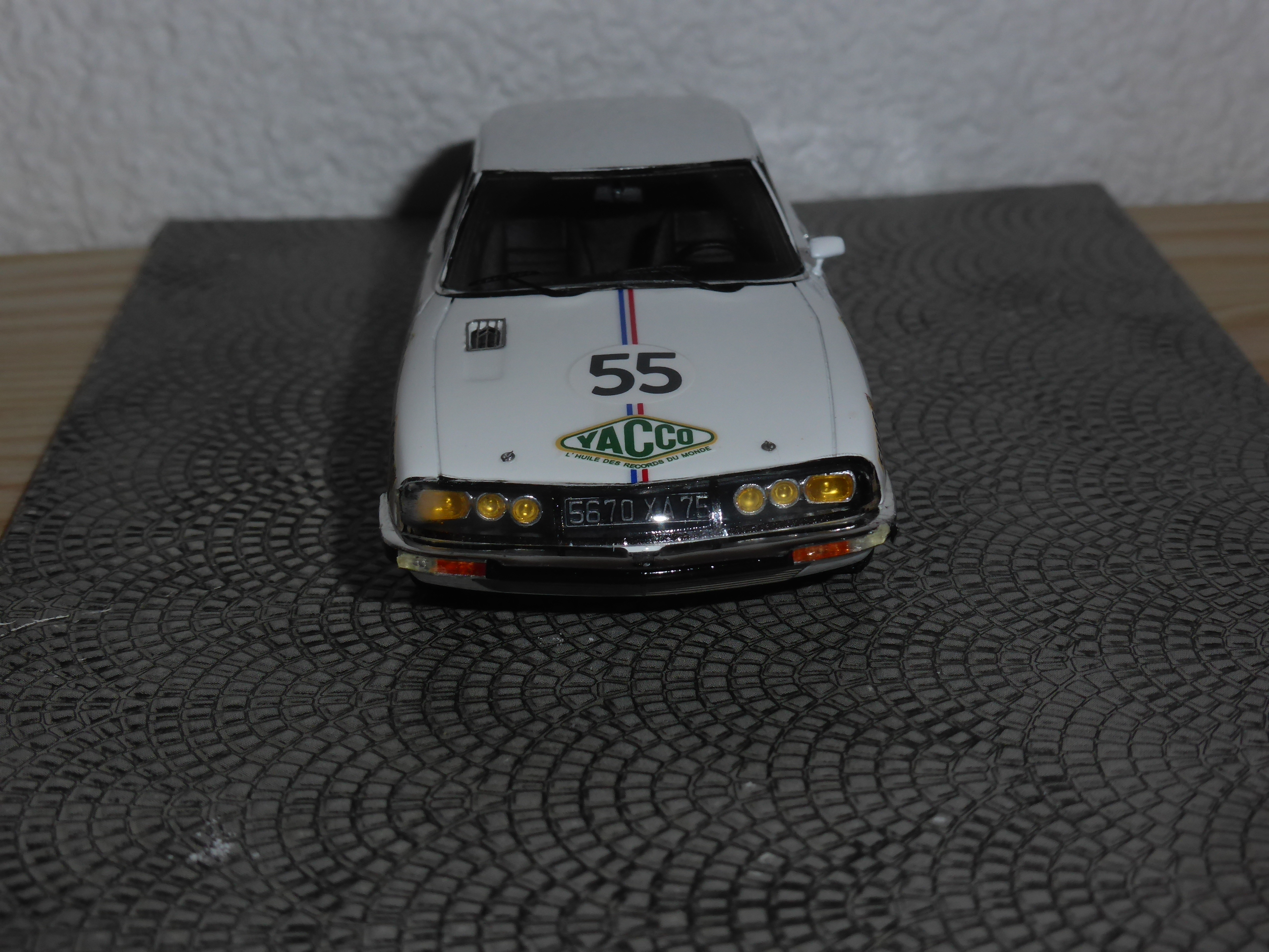 La verniciatura è perfetta, così come la posa delle decals, che essendo poche, sono quasi del tutto esenti dall\’orrendo effetto di un unico film che unisce diversi gruppi di sticker (ma il logo Yacco sulla parte anteriore della fiancata è unito alla scritta AGACI, che è più in basso di sei millimetri e due). Io non mi stancherò mai di ripetere che l\’effetto è antiestetico. In ogni caso ci troviamo di fronte a un modello interessante e importante in ogni collezione Citroen e Le Mans. La SM del 1972 è ad oggi l\’ultima Citroen ad essere stata iscritta alla 24 Ore.