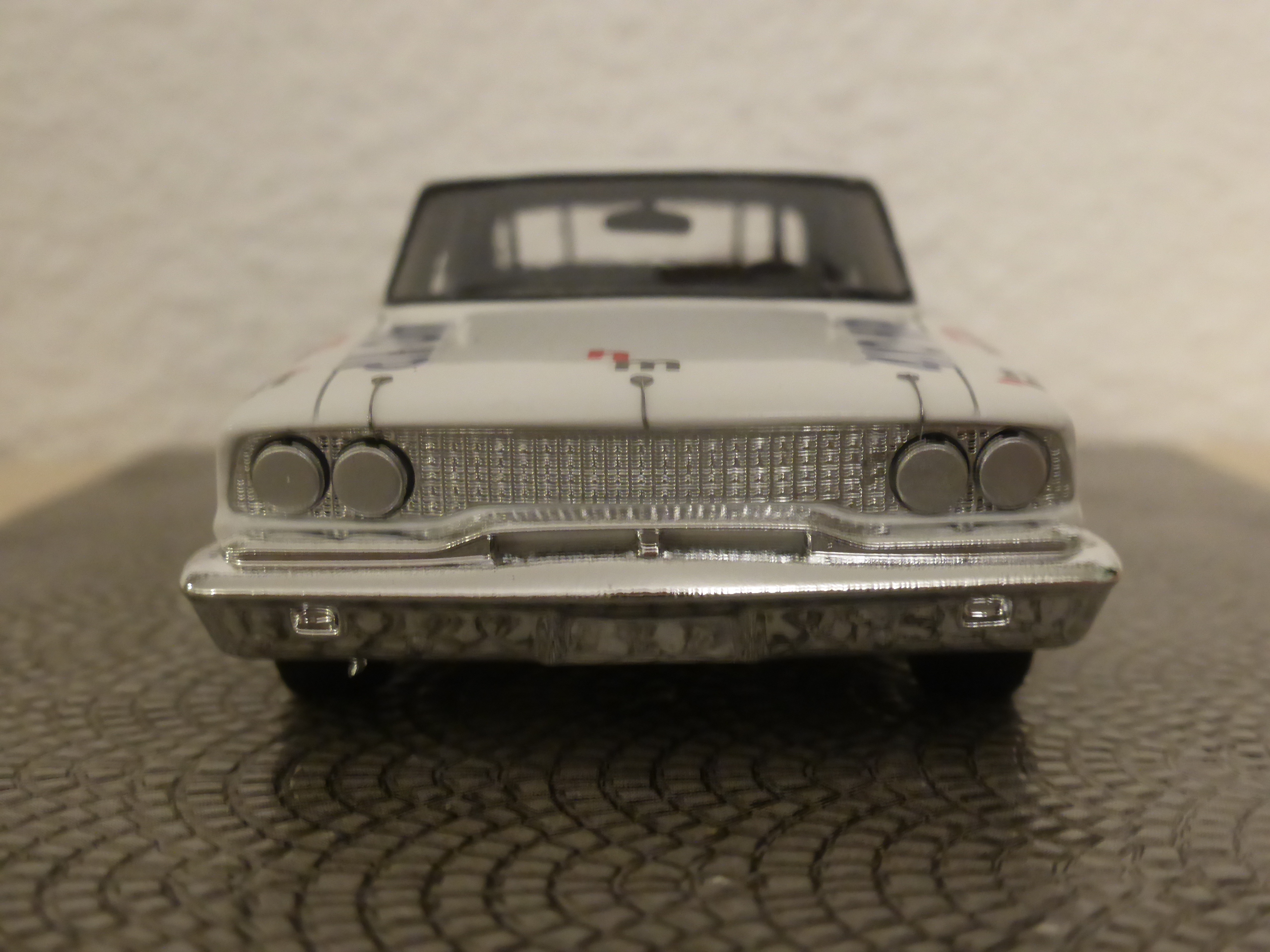 Esterni: Verniciatura ottima come sempre. Decals applicate molto bene (tralascio il discorso della pellicola che accorpa ecc ecc tanto ormai lo conoscete). Cromature eccellenti, solo una linea di giuntura sul paraurti anteriore, che sulle altre Galaxie di Spark non avevo rilevato. Strano. Ruote realistiche con gomme adeguate e scritta Goodyear in tampografia.