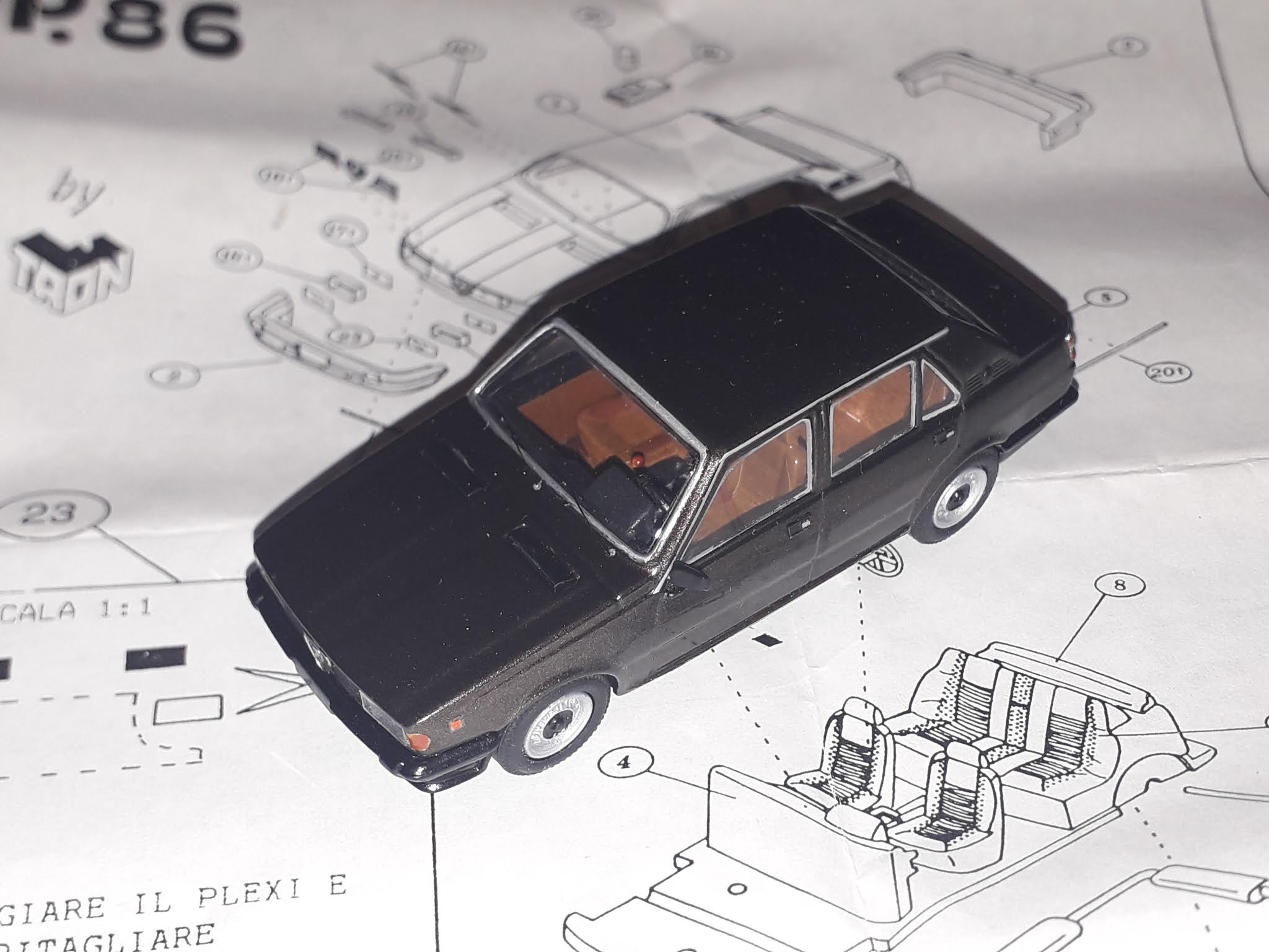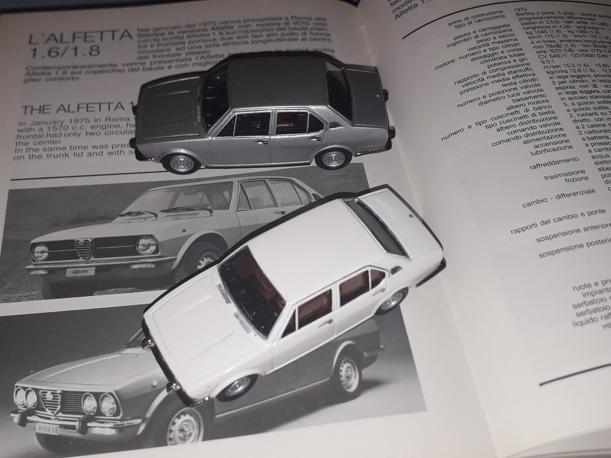 Originariamente dotati di livree e accessori per realizzare versioni Carabinieri e Polizia, i kit sono stati invece montati con allestimenti civili. Le Alfetta sono delle 1.8 prima e seconda serie; all\’inizio, l\’intento era quello di ottenere una 1.8 e una 1.6 ma quest\’ultima versione era incompatibile con i paraurti forniti nel kit, con i rostri stampati in corpo unico, impossibili da eliminare senza danneggiare la nichelatura. Ne sono quindi venute fuori due interpretazioni della 1.8, in colori classici che ne esaltano le forme semplici ed eleganti. La Giulietta prima serie è stata invece verniciata in un più sofisticato \”luci di bosco metallizzato\”, con una combinazione di interni coerente con la tinta della carrozzeria, il tutto riprodotto seguendo la documentazione dell\’epoca. In questo caso è stata ricostruita tutta la vetratura laterale, poiché l\’acetato del kit, stampato malissimo, era pieno di macchie e tracce varie (cosa abbastanza frequente con i termoformati, ma in questo caso i difetti erano davvero troppo evidenti per non intervenire). Mi sono divertito a fotografare le due Alfetta sul libro del Fusi, un classico del suo genere, mentre per la Giulietta lo sfondo è quello delle… istruzioni del kit. Credo che a fronte di una produzione cinese che spessissimo scivola sulle proverbiali bucce di banana, i kit nostrani possano costituire un\’alternativa (di nicchia, ma pur sempre un\’alternativa) per mettere in collezione modelli storicamente corretti. Siamo lontani dalle sofisticazioni che oggi ci offrono i resincast ma il colpo d\’occhio di queste tre Alfa realizzate e montate \”qui da noi\” è qualcosa in grado di regalare un\’emozione. E non mi pare poco.