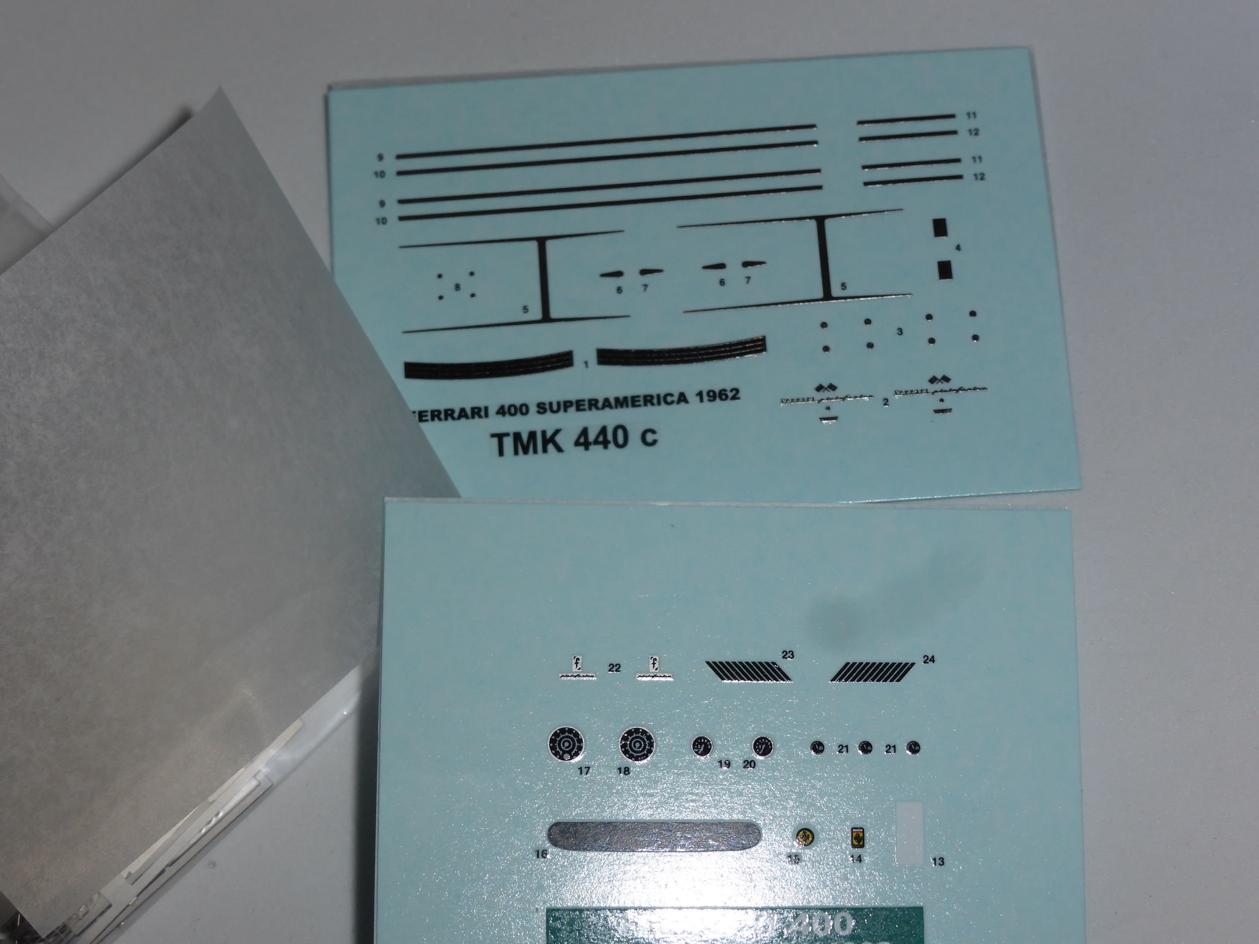 Due foglietti di decals (in doppio esemplare) di cui uno con fregi cromati corredano il kit. Qualcuno, secondo me poco opportunamente, ha criticato la scelta di simulare le grigliettine laterali con delle “semplici” decals, suggerendo che esse avrebbero potuto essere meglio copiate con una fotoincisione. Ora, a parte l\’esiguità dei pezzi – le griglie sono davvero piccole – la loro forma si presenta piuttosto adatta ad essere riprodotta con una decal.