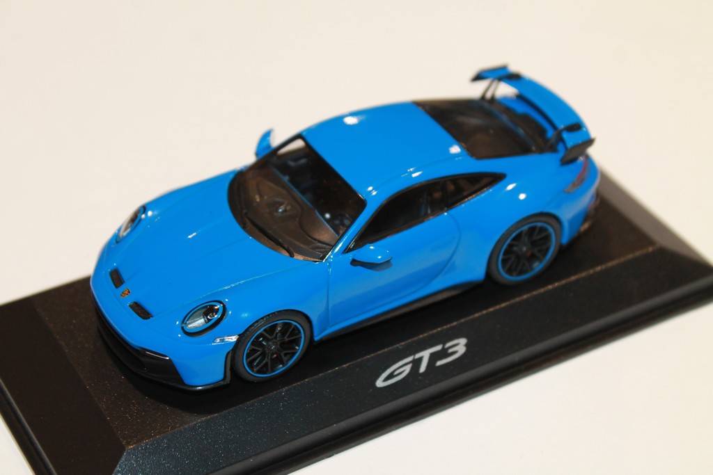 La versione GT3 della Porsche 911 serie 992 è stata appena presentata e già Minichamps ha pronto il modello diecast in scala 1:43. Per il momento si tratta di un\’edizione per i concessionari Porsche, in blu chiaro (codice WAP0201490M005) ma lo stampo è destinato ovviamente ad essere declinato come sempre in una serie infinita di varianti di colore, sia come promozionale sia come modello della gamma standard Minichamps.