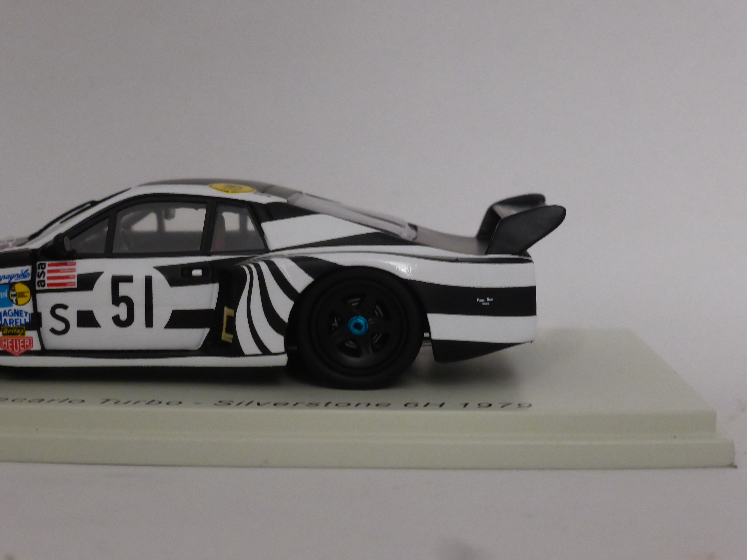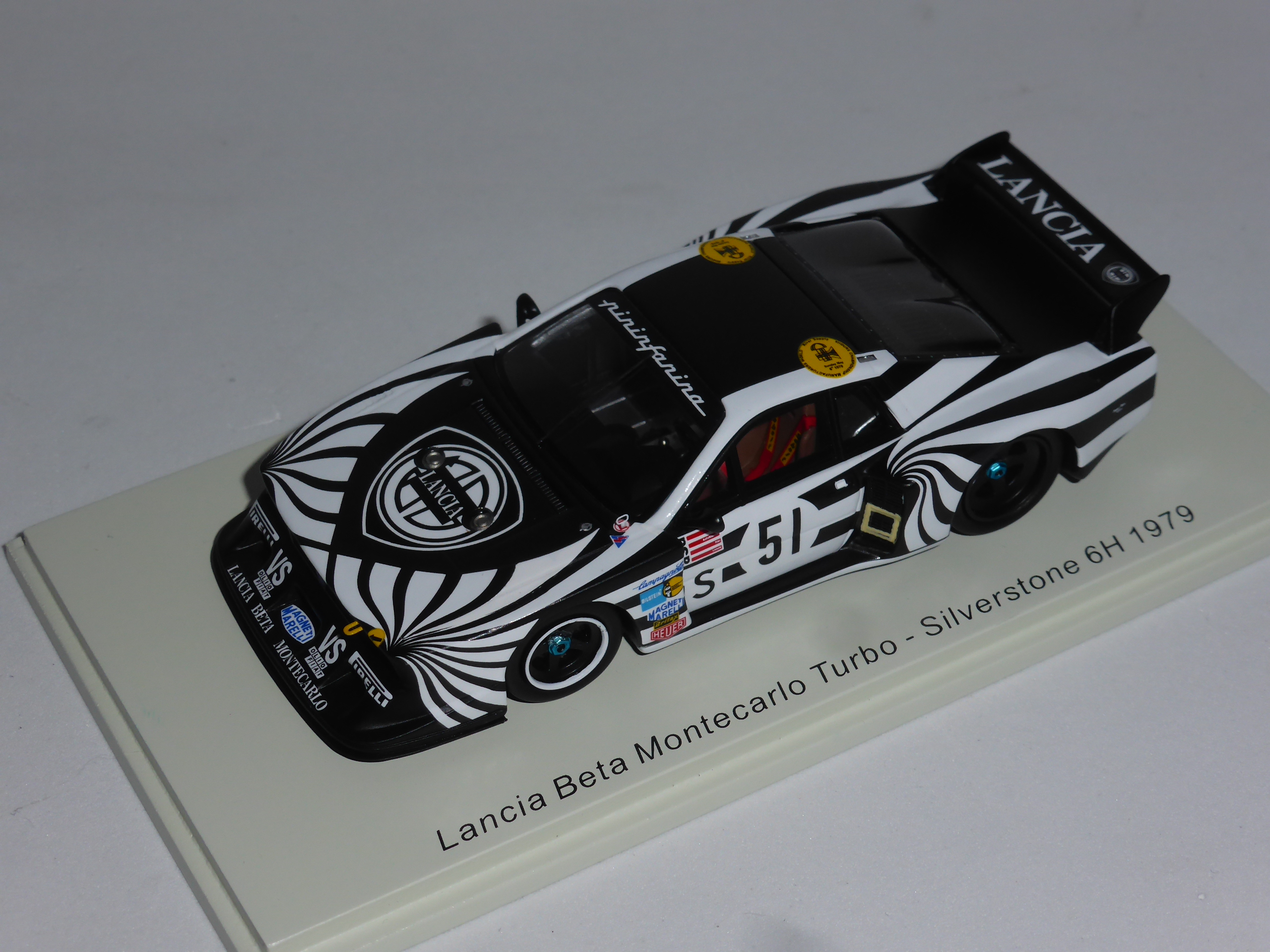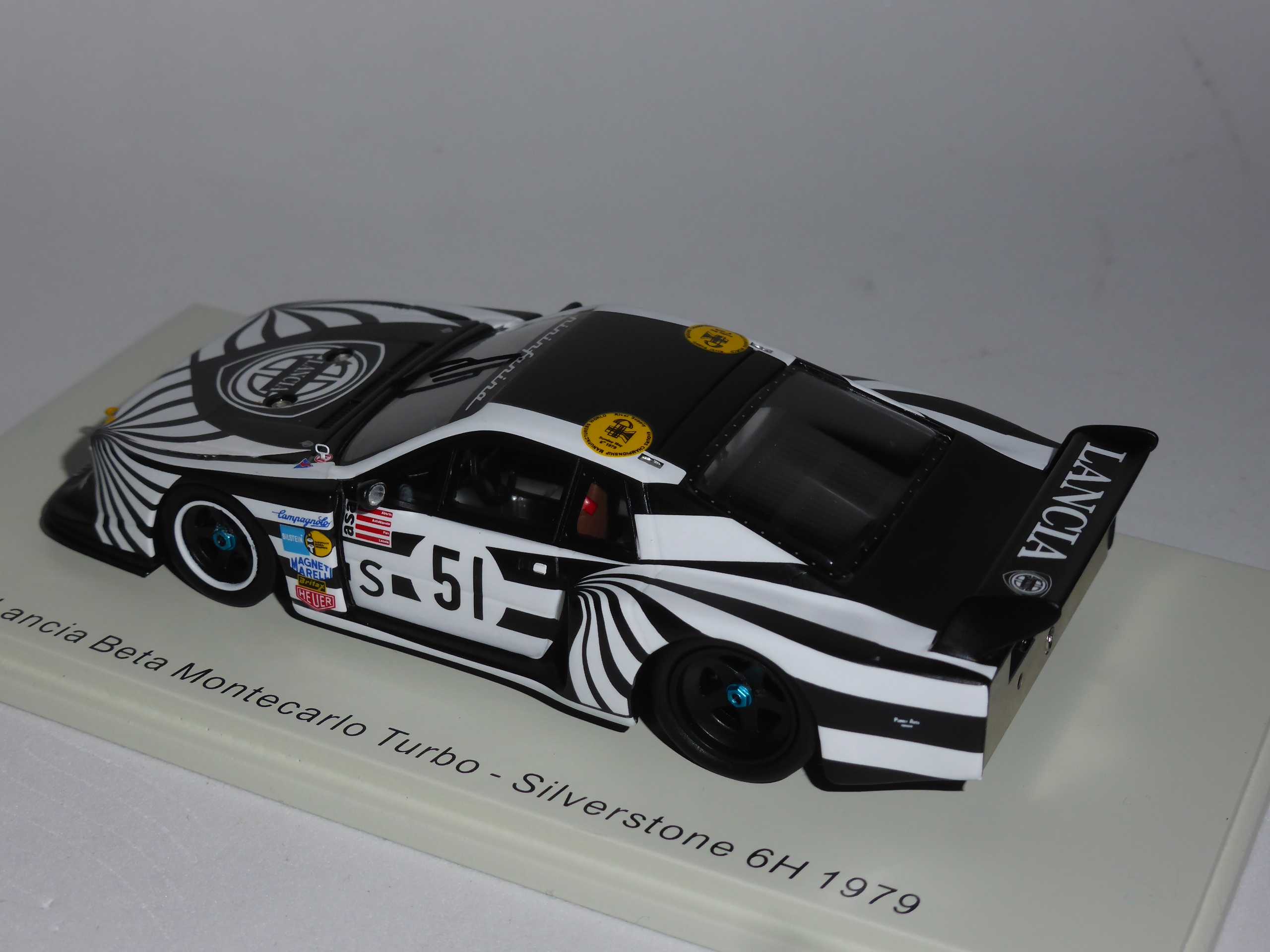 Spark ha già ampiamente scavato nella storia della Lancia Beta Montecarlo Gruppo 5, ma ora è la volta di una versione fondamentale, quella dell\’esordio in gara della vettura, alla 6 Ore di Silverstone del 1979, con Riccardo Patrese e Walter Roehrl. Nel corso del 1979 la Beta Montecarlo Gruppo 5 fu sottoposta a una serie di costanti miglioramenti, con l\’impiego di uno o due esemplari in varie prove del Mondiale Marche. Dopo Silverstone, la Beta si rivide in altre occasioni, con una livrea diversa (strisce rosse anziché bianche), sempre su carrozzeria nera opaca. Nel corso del 1979, le Beta Montecarlo furono oggetto di leggere modifiche gara per gara. A parte la combinazione coda corta-muso senza lama (Vallelunga, Pianta/Alen), le principali variazioni riguardarono lo specchio di poppa.