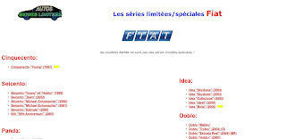 I modellisti sono spesso alla ricerca di documentazione sulle serie limitate delle vetture stradali. Negli anni centinaia di piccole serie si sono succedute nei listini, destinate a durare lo spazio di un solo anno se non giusto di qualche mese. Non è facile orientarsi in questa selva di versioni e sotto-versioni, soprattutto nel caso di costruttori generalisti quali Fiat, Peugeot, Renault o Citroen, che dagli anni settanta inondano il mercato di decorazioni, livree e allestimenti \”speciali\”. Esiste un repertorio francese, http://www.autos-series-limitees.fr/ che, nato addirittura nel 2002, elenca ormai più di 4800 serie limitate, catalogate per marchio. Per ogni versione si forniscono alcune foto e dei dati che possono variare da una semplice nota a dettagli molto più abbondanti nel caso l\’autore sia in possesso di cataloghi o di altro materiale di prima mano.