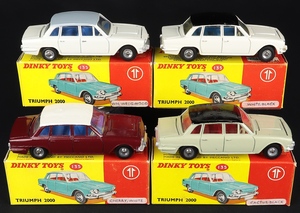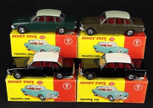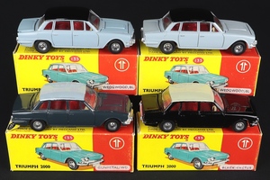 Per gli appassionati di modelli d’epoca, questo potrebbe essere classificato come l’evento dell’anno: l’arrivo sul mercato di un set più unico che raro, contenente dodici modelli per dieci varianti di colore – due sono doppioni – della Triumph 2000 della Dinky (135) destinate a un uso promozionale nei concessionari. E’ presente naturalmente anche la più rara di queste versioni, in gun metal/wedgwood. Come molti sapranno, questi colori speciali della Triumph promozionale avevano una scatola con un’etichetta sulla quale erano indicate le combinazioni dei colori: white/black, white/wedgwood, cherry/white, cactus/black, black/white, conifer/cactus, olive/cactus, wedgwood/black, black/cactus e appunto gunmetal/wedgwood.