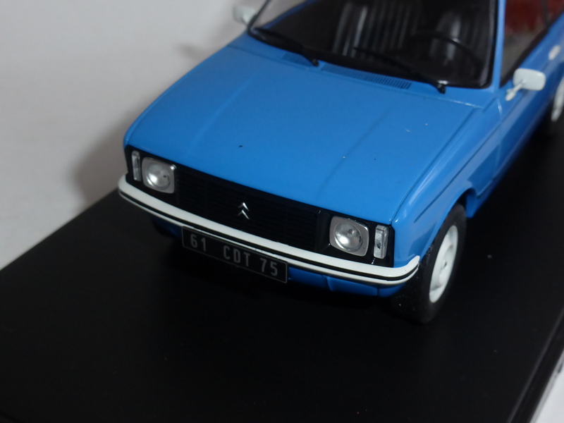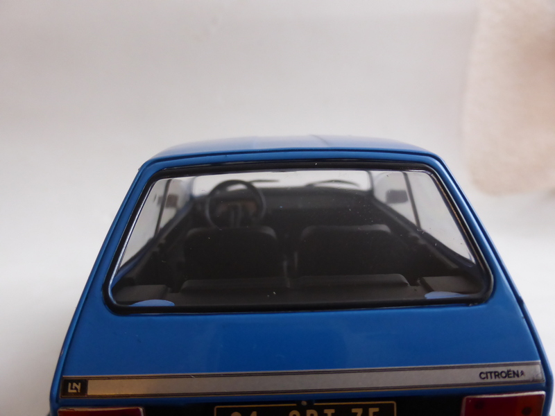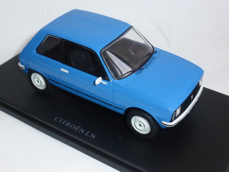 Come di consueto, le linee dei modelli di Collection Citroën sono azzeccate. La LN è l’uscita numero 47 di questa serie distribuita da Hachette. La verniciatura è uniforme e senza grossi difetti, anche se qualche bollicina o imperfezione si notano. Non sono bellissimi i supporti della scocca che emergono dalla cappelliera. Presentata al Salone di Parigi del 1976, la LN doveva contribuire nel neo-formato gruppo PSA a contrastare la concorrenza della Fiat 127 e della Renault 5. Gli interni sono ben riprodotti ma i sedili sono privi di ogni decorazione. Ma la parte della seduta non aveva un caratteristico motivo pied-de-poule?Il posteriore della LN era caratterizzato da una fascia nera tra i gruppi ottici posteriori e una banda adesiva in alluminio satinato con la sigla del modello e la marca. Tutto l’essenziale è ben riprodotto, dai paraurti dal caratteristico colore grigio ai fanali. Immatricolazione parigina per il modello Hachette. I contorni del parabrezza sono tampografati. Curiosa la presenza dello specchietto retrovisore destro, in un periodo in cui già trovare quello di sinistra era un miracolo…Le superfici vetrate sono ben stampate, perfettamente trasparenti e senza graffi o imperfezioni. La LN riprendeva i fari rotondi della Dyane con la cornice quadrata alluminio. Sul modello tutto è ben fatto, compresa la parte di carrozzeria sotto il paraurti, con le prese d’aria e le pannellature. Decisamente grossolani i ganci traino in plastica. Al limite non era meglio ometterli completamente? I piccoli paraurti in acciaio erano quelli della Peugeot 104 e furono conservati fino al luglio 1982 quando la vettura, già diventata LNA, adottò degli elementi in plastica più vistosi e avvolgenti. Ben riprodotti gli pneumatici. La LN prima serie montava i Michelin ZX 135 SR13. Ottima la fattura dei tergicristalli. Le uscite d’aria, il cui interno è tampografato, sono scavate nella carrozzeria, con un buon effetto finale. I montanti laterali sono stampati in rilievo con il gruppo in plastica dei vetri e tampografati, una soluzione più che soddisfacente su modelli di questo tipo, applicata anche sugli 1:18. Le protezioni laterali (una specificità della LN rispetto alla Peugeot 104) sono tampografati. La LN ricevette dei piccoli cerchi da 13″, in luogo dei tradizionali cerchi da 15″ delle altre piccole Citroën. Inizialmente erano sprovvisti di borchie, che vennero introdotte solo sulla LNA, nel novembre 1978. Sul modello ci si è dimenticati di dipingere gli occhielli in nero, un intervento abbastanza facile per i più esigenti. Qualche perplessità l’abbiamo sul colore del cerchio, che nel modello è lo stesso dei paraurti, mentre ci pare che una tonalità più tendente all’alluminio sarebbe stata preferibile.