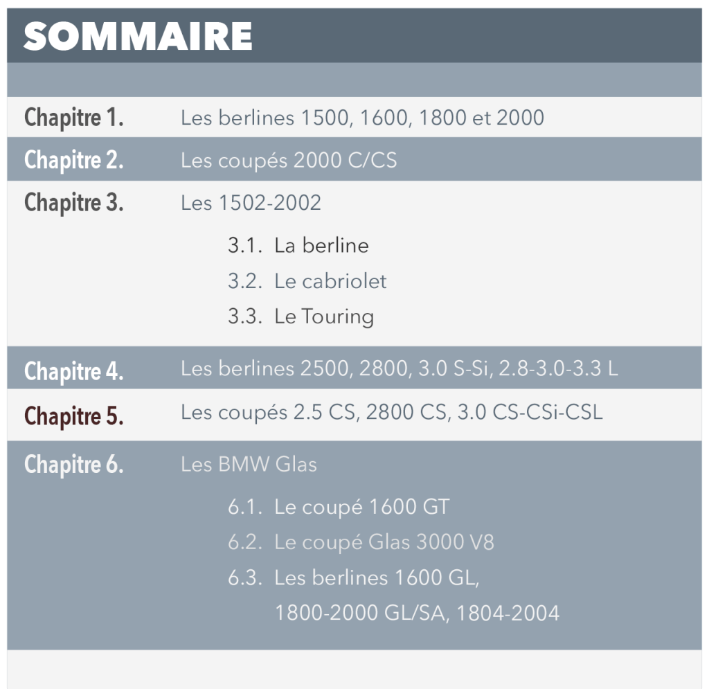 Le guide di Auto Forever sono molto apprezzate per la loro precisione e completezza. Il nono volume della collana sarà la terza parte della storia consacrata alla BMW. In questo nuovo libro saranno analizzati i modelli 1500-2002, 2500-2800-3.0S e 3.0CS, incluse le versioni speciali e da competizione. L’uscita di “Le guide de toutes les BMW vol.3” è prevista alla fine di ottobre. Pubblichiamo un estratto del libro e l’indice.