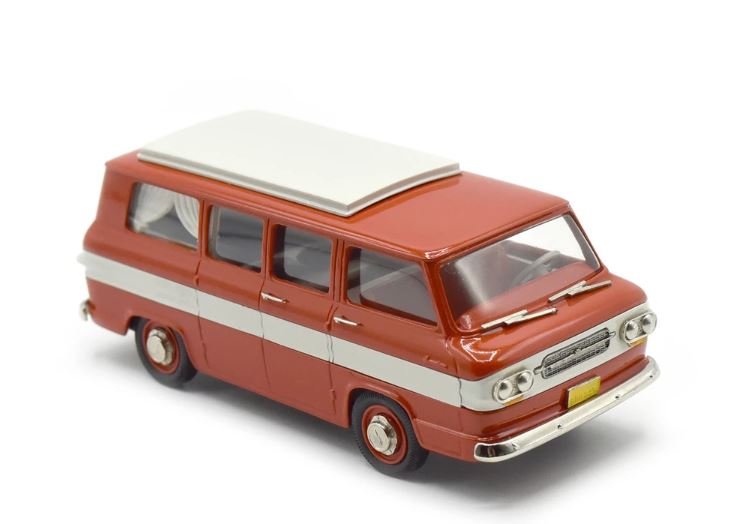 Sfruttando lo stampo della Chevrolet Corvair Greenbrier sport wagon 1962, Brooklin presenta ora la versione camper, con interni specifici, tendine e riproduzione del tetto estendibile. Il numero di catalogo è BRK213A. Metallo bianco, scala 1:43, come d’abitudine.
