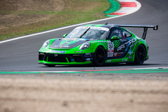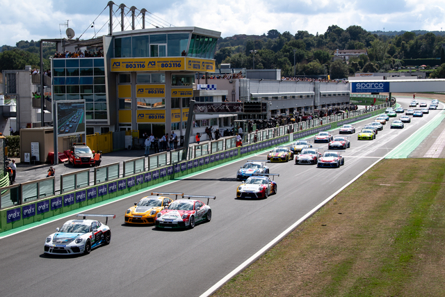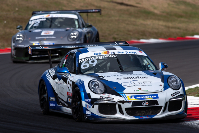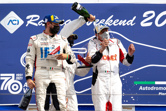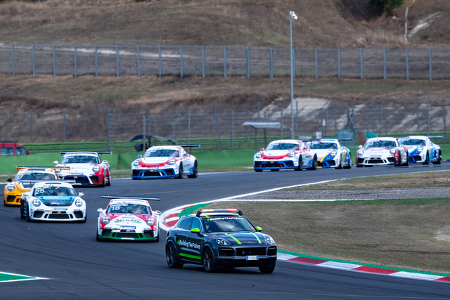 Gara 2 è stata molto combattuta, caratterizzata da tre periodi di safety car per le uscite di pista di Piero Randazzo, Marco Cassarà e Leonardo Moncini e ha vissuto numerosi colpi di scena, non ultimo quello che ha visto penalizzato di 5 secondi Daniele Cazzaniga. Il pilota di Ghinzani Arco Motorsport – Centri Porsche Milano aveva tagliato il traguardo in prima posizione nella volata finale della ripartenza dalla terza safety car dopo aver superato Giardelli e Fulgenzi nelle fasi iniziali, ma già durante la corsa gli era stata comminata la penalità proprio per il contatto occorso con il vincitore in fase di sorpasso. I 5 secondi di handicap lo hanno fatto precipitare in 14esima posizione favorendo i rivali che lo inseguivano. Fulgenzi ha così potuto celebrare il ritorno alla vittoria dopo quasi due anni dall’ultima volta nel monomarca di Porsche Italia, mentre con i punti del secondo posto Giardelli torna al comando della classifica a pari punti con Gianmarco Quaresmini. Complicata la gara dell’alfiere di Tsunami RT – Centro Porsche Brescia, che nelle fasi iniziali ha perso terreno nel duello con Cerqui ed è stato costretto a rimontare fino alla quinta posizione finale alle spalle di Leonardo Caglioni, che dopo gli exploit di sabato ha concluso quarto la gara domenica con la prima 911 GT3 Cup di Ombra Racing – Centro Porsche Padova, mentre il compagno di squadra Aldo Festante ha segnato il giro più veloce di gara 2 in 1’35”913. La rincorsa al titolo è ancora del tutto aperta anche per Cerqui, che grazie al secondo podio del weekend si è portato a soli 8 punti dal duo di testa Giardelli-Quaresmini.