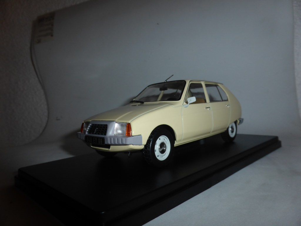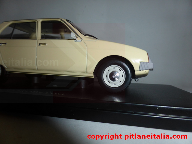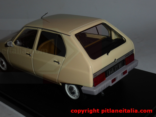 Un mono-tergicristallo puliva l’ampia superficie del parabrezza, una caratteristica di Citroën inaugurata con la CX e destinata a proseguire sulle BX, AX e ZX. Gli interni sono riprodotti con scrupolo e non mancano i caratteristici “satelliti” al volante, chiamati PNR (pluie, nuit, route), che raggruppavano i comandi essenziali che potevano essere così attivati senza togliere le mani dal volante. Sulla versione Club erano presenti le borchie ai cerchi ma non le protezioni laterali.