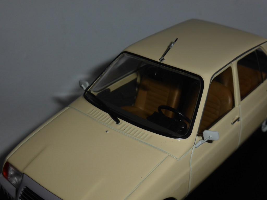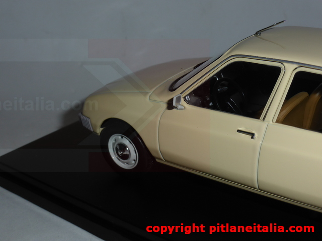 Gli archi superiori delle portiere non sono in fusione col resto della carrozzeria ma sono ottenuti verniciando in beige il blocco in plastica trasparente dei vetri. L’escamotage è ben riuscito per un’idea finale di discreta finezza. Su tutti gli esemplari esaminati l’antenna presentava un piccolo difetto di fusione quasi a metà della sua lunghezza. Fra i particolari meglio riprodotti vi sono i tergi in plastica nera e le maniglie cromate, riportate sulla carrozzeria. Da questa inquadratura si può apprezzare la buona trasparenza delle superfici vetrate, che lasciano ammirare un interno piuttosto completo: merita il massimo dei voti il cruscotto e anche la selleria è ben riprodotta. Validi anche i pannelli delle portiere mentre manca totalmente il “cielo”.