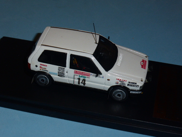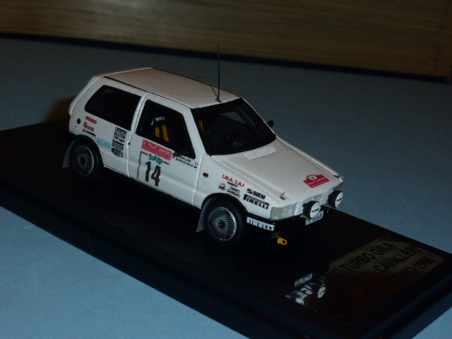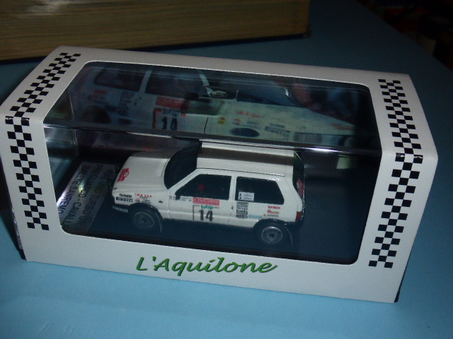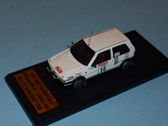 Segnaliamo un’edizione limitata a dieci pezzi numerati della Fiat Uno Turbo Gruppo A pilotata da Mauro Pregliasco con Cavalleri come navigatore al Rally di San Remo del 1986. L’ha commercializzata il negozio L’Aquilone di Torino. La base e il montaggio sono Mati Model. Il modello è ben dettagliato con parti fotoincise (ganci cofano, tergi…) e si caratterizza per il disegno originale dei cerchi, diverso dai soliti visti sulle Uno Turbo da rally. La scatola riporta i loghi dell’Aquilone e nella confezione è presente un certificato col numero progressivo del modello.