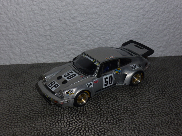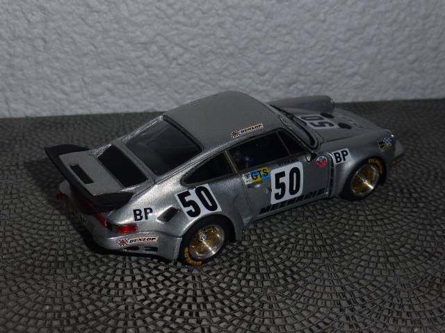 Per questo episodio di “Storie di modelli”, rubrica che voi lettori apprezzate molto, non parliamo di Spark ma di quello che uno Spark può suggerire. La Porsche 911 Carrera RSR di Meznarie, la Gruppo 4, corse a Le Mans nel 1974 e nel 1975. Quella del 1974, color oro, è già stata “sparked”, quindi che vi frega. L’altra, color argento, ancora no. In attesa che Spark se ne occupi, mi sono divertito a svitare una recente realizzazione Madyero dalla sua basetta, per creare un’ambientazione semplice ma un po’ più originale. Nei noiosi anni del liceo, le trasformazioni su base Porsche erano il mio divertimento del sabato pomeriggio. Alla fine degli anni ottanta si trovavano da Paolo Tron a Milano i foglietti di decals di Michel Elkoubi. La documentazione era quella che era e bisognava a volte tirare a indovinare. Però qualche soddisfazione me la sono tolta, tipo elaborare una 934 Solido per ottenere la numero 54 di Le Mans 1976, allargando i passaruota e costruendo da zero lo spoiler posteriore col lamierino, andando a lume di naso per poi scoprire anni più tardi che grosso modo ci avevo preso.