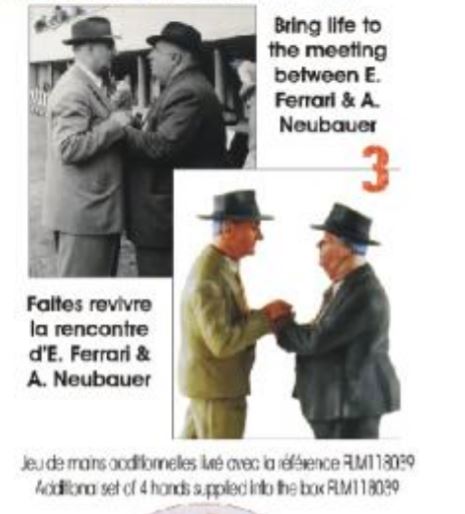 Le Mans Miniatures ha realizzato di recente due figurini in 1:18, già montati e decorati, che permettono di ricostruire la scena. Ferrari e Neubauer, in pose differenti, erano già presenti nella gamma 1:18 di LMM, ma erano ormai esauriti.