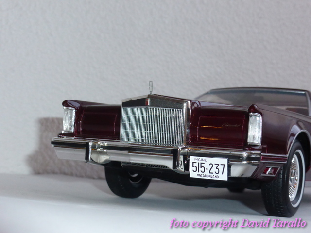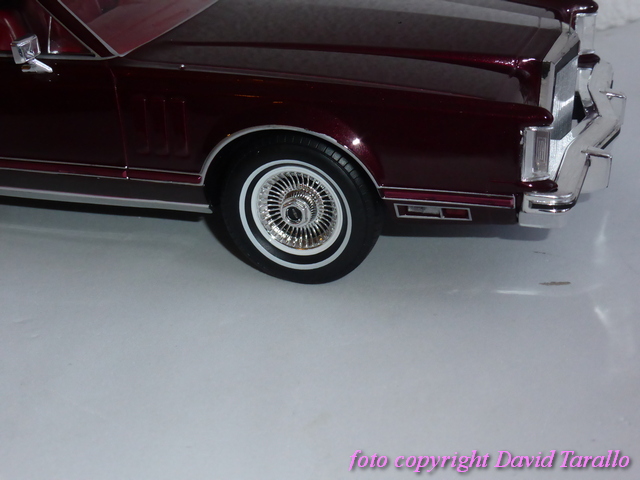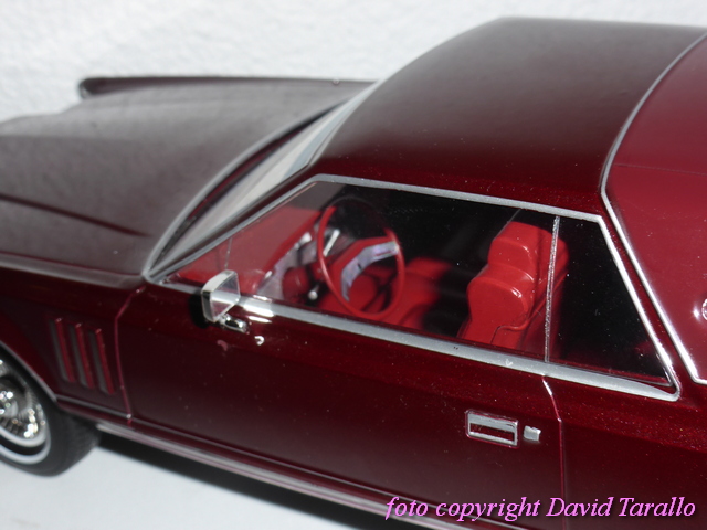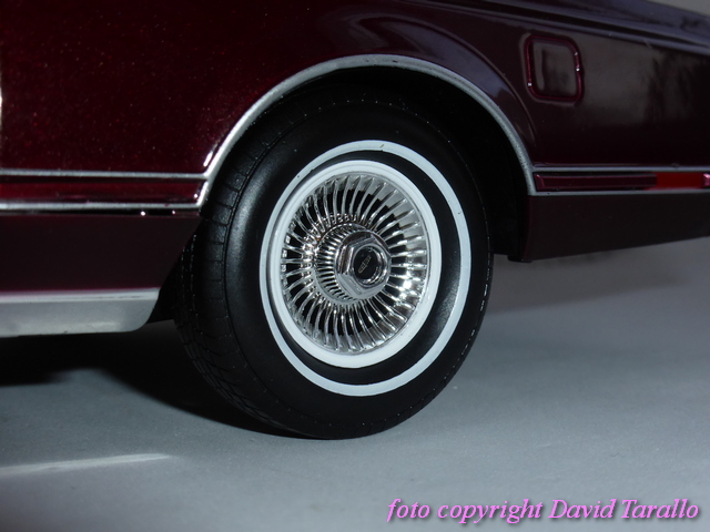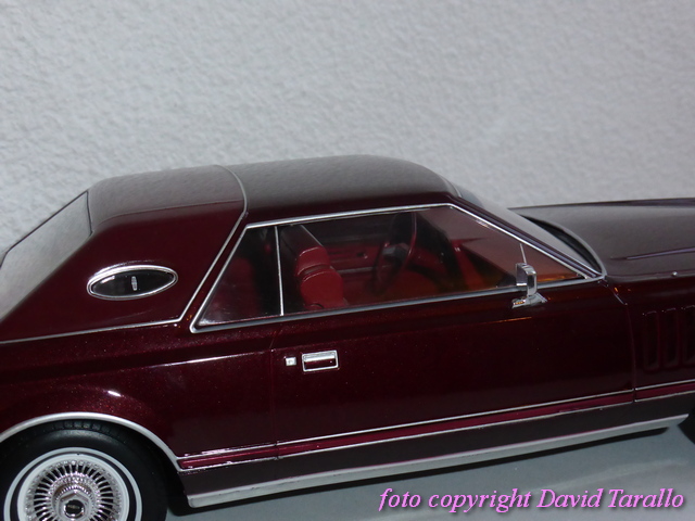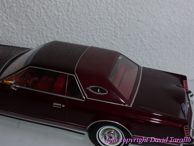 Esterni: il modello in nostro possesso è un pre-serie, ma tutte le finiture sono validissime, a cominciare dalla verniciatura, di un bel rosso scuro metallizzato, piuttosto uniforme e sufficientemente coprente. Molto ben trattate anche le parti cromate, con le belle ruote con i finti raggi, equipaggiate di pneumatici con fascia bianca. E’ tutto molto lussuoso, secondo uno stile tipico delle americane di quel periodo. La parte posteriore del padiglione imita la linea di un “faux cabriolet”, con un color marrone che fa da perfetta combinazione al bel rosso rubino del resto della carrozzeria.