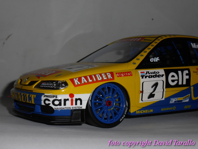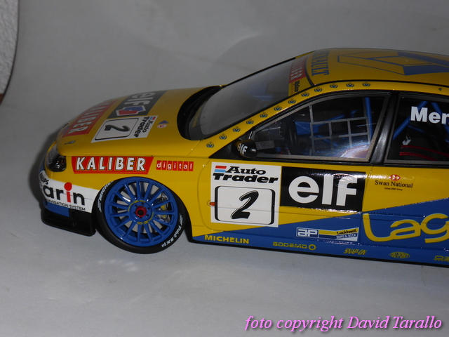 Il modello si presenta con un colpo d’occhio notevole: appariscente nella sua livrea giallo-blu, dà immediatamente l’impressione della grinta e della forza della vettura reale. Per ragioni produttive, i due colori sono separati da un leggero solco, che facilita le operazioni di mascheratura. E’ un tratto comune a tutti i resincast prodotti in Cina: non è forse il sogno dei collezionisti più esigenti, ma attualmente è il compromesso meno peggiore che si possa concepire. Va anche detto che nel caso della Laguna, il solco è davvero poco visibile. La versione riprodotta è quella di Silverstone, gara conclusiva del BTCC 1997, dove la Laguna di Menu portava sui montanti gli adesivini Renault e Michelin che ricordavano ciascun successo stagionale. A Silverstone quasi non bastava una macchina intera per attaccarli uno dietro l’altro…