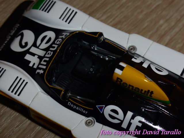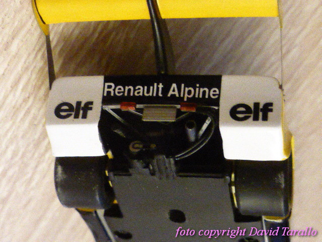 Molto ben fatta l’ala posteriore, composta da elementi in resina e in fotoincisione. I cerchi sono molto sobri e personalmente li avrei visti meglio in grigio scuro piuttosto che neri. La scritta Elf anteriore avrebbe potuto avere le lettere leggermente più fini. Per il resto, il modello offre solo soddisfazione al collezionista. Posteriormente sono riprodotti i fanalini e qualche particolare della meccanica visibile fra i pannelli della coda: tubo di scarico, elementi del telaio, radiatore, cavetti.