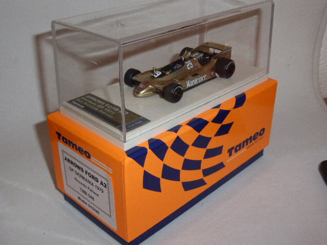 In materia di Formula 1 anni cinquanta o primi sessanta, alcuni marchi artigianali come Renaissance o Jade da molti anni propongono modelli montati di ottima qualità, concepiti però per pochi eletti. Non è il target di Spark. E non miravano al target di Spark neanche i Tameo delle serie TB e TMB, durati troppo poco. Certo, alcuni modelli andavano esauriti nel giro di un paio di settimane, segno che almeno le quantità erano ben calibrate alla domanda. Tameo era riuscito a superare i problemi tecnici che si pongono quando si prova a vendere una Formula 1 montata: fragilità del modello stesso, imballo, accuratezza dell’allineamento di ruote e sospensioni. Con un sistema semplice ma efficace, i Tameo montati erano saldamente ancorati alla basetta e personalmente non conosco nemmeno un caso in cui qualche pezzo si sia staccato durante una normale spedizione, e questo non è poco. Però, purtroppo, i Tameo montati sono ormai un ricordo. In magazzino restano poche referenze: un paio di Ferrari 126CK, le Tyrrell P34 del ’77 e le Arrows A2 del 1979. Sarebbero modelli da prendere, perché rappresentano uno sforzo di conciliare un prezzo tutto sommato ragionevole ad una qualità costruttiva di tutto rispetto. Si parla di modelli in metallo bianco, praticamente di kit montati, verniciati bene e rifiniti in modo piuttosto semplice ma impeccabile.
