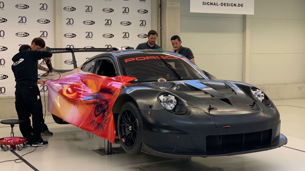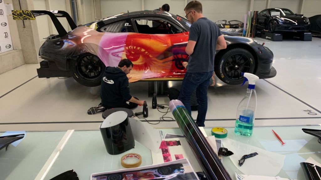La livrea 2D fu stampata in grandezza naturale e poi applicata all’auto utilizzando pellicole viniliche e pistole termiche grazie all’abilità degli esperti in “carwrapping” di Signal Design (che hanno realizzato anche la pellicola della livrea per la Taycan “floreale”). L’involucro che componeva la livrea era diviso in 9 sezioni e doveva essere messo in ordine, cosa non facile, considerando i rigonfiamenti, gli intagli e le curvature della Porsche 911 RSR GTE che costrinsero i tecnici di Signal Design ad apportare molte modifiche, allungamenti e inclinazioni per consentire alla pellicola di adattarsi alle linee della vettura.