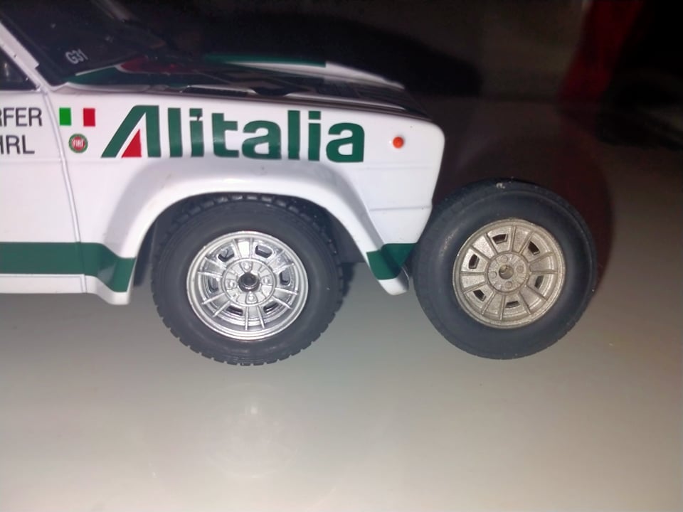 Dettagli difficili da accettare al 100% su dei (bei) modelli in scala media, ma che sono facilmente ovviabili da chiunque, regalando anche divertimento e un certo gusto per l’elaborazione ormai perduto, che fa quasi tornare ai tempi dei vecchi Solido del tempo che fu. I sedili di pilota e navigatore sono giustamente diversi, come diverso è il loro posizionamento, e l’assetto è buono, forse solo leggermente basso data la gara su sterrato “brutto” (si fa notare che l’assetto da asfalto della versione edicolosa del Monte 1980 era perfetto). Ruote: ottime, e giustamente differenziate tra avantreno e retrotreno, pur con un grosso “ma”: è pur vero che in questa gara i 31 ufficiali montavano ruote posteriori più larghe e con una foggia diversa, ma le ruote anteriori hanno un disegno decisamente sbagliato. In pratica, Ixo ha prodotto dei bellissimi cerchi, molto ben definiti e proporzionati, ma perfetti per la “vecchia” 124 Abarth, e non per la 131. Ok le ruote posteriori, come anche il disegno del battistrada, e la relativa spalla de