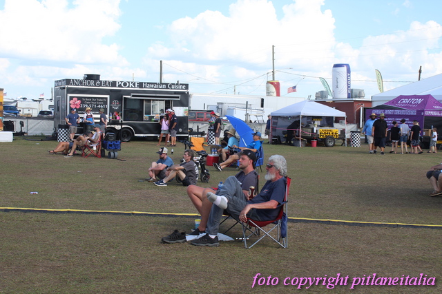Sebring non sarebbe Sebring senza il Green Park, tradizionale luogo di aggregazione fin dalle origini della 12 Ore. E’ l’infield del circuito, che come molti sapranno non ha tribune. Presso il retro del paddock la vita sociale è un po’ più organizzata. Man mano che si lasciano le aree periferiche del Green Park, si entra in un mondo parallelo, caratterizzato dalle varie popolazioni delle curve, che meriterebbero un discorso a parte (vedere già la gallery sul Turn 10).