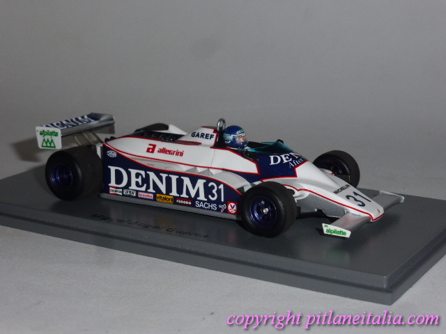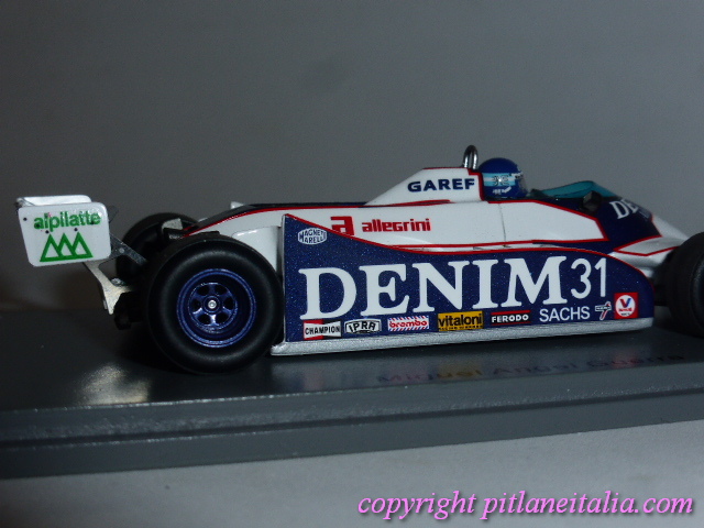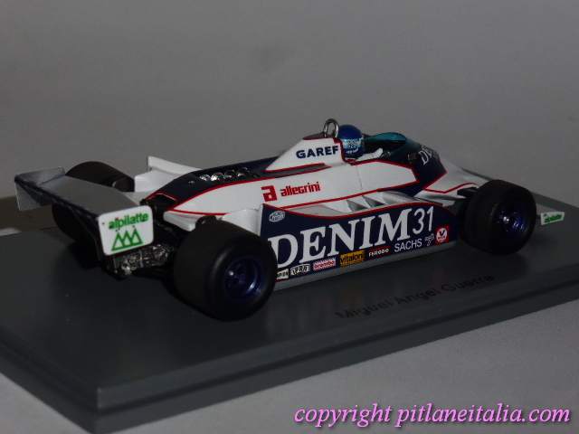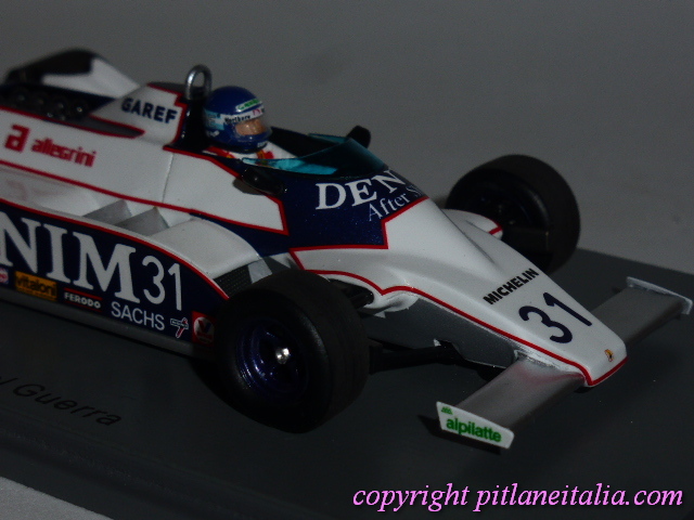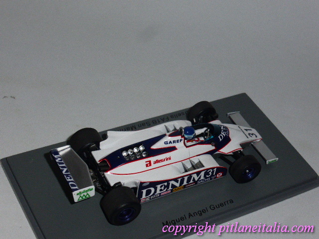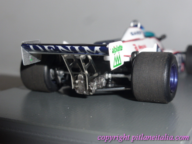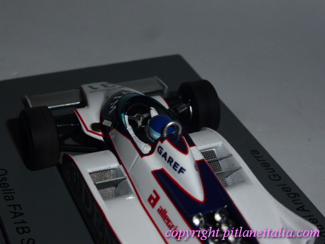 Corretto è anche il colore blu metallizzato dei cerchi, su cui sono montati dei realistici pneumatici leggermente “consumati”. Ben trattati il parabrezza, in materiale trasparente blu, e il casco di Miguel-Angel Guerra (stranamente la decal Marlboro presente sulla visiera stavolta è stata applicata da Spark, forse perché microscopica). Convincenti anche gli specchietti Vitaloni, dalla forma più originale rispetto a quella di molte altre monoposto del periodo, e provvisti naturalmente della loro parte riflettente.
