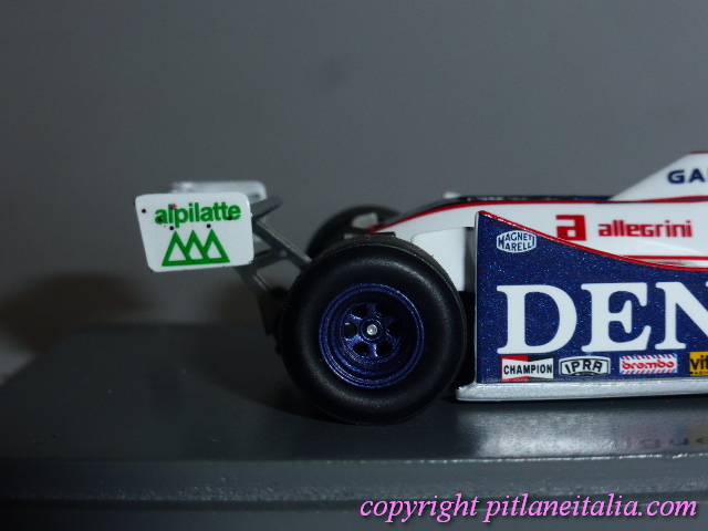 Mancano qua e là alcuni piccoli particolari che sarebbe stato possibile includere, come alcuni rivetti laterali che avrebbero fatto tranquillamente la loro figura anche in decal, ma probabilmente la fretta con la quale vengono cotti e mangiati decine di progetti al mese non consente di soffermarsi con la dovuta attenzione su certi aspetti, diciamo così, “secondari”. Ci pare oltretutto che siano state omesse le scritte Michelin sui baffi anteriori, che appaiono nelle foto relative al GP di Imola.