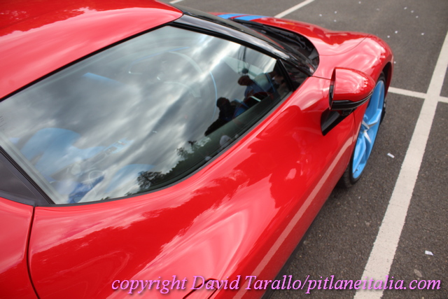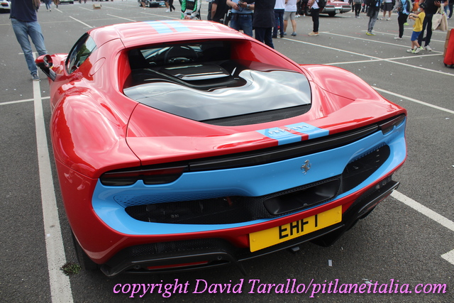 In attesa della versione competizione della Ferrari 296 GTB, alcuni proprietari si sono già sbizzarriti con livree che ammiccano più o meno direttamente a indimenticate combinazioni del passato. E’ il caso dell’esemplare che vi presentiamo in questa pagina, visto in occasione della Parade des pilotes ieri 10 giugno a Le Mans. Guida a destra, immatricolato in Gran Bretagna, combina il rosso Ferrari con il Cambridge Blue utilizzato negli anni cinquanta-sessanta-settanta dalle vetture schierate dal Maranello Concessionaires del colonnello Hoare, importatore Ferrari nel Regno Unito. A confronto delle tante cafonate che circolano, questa macchina ci è sembrata degna di attenzione. Belli i cerchi nello stesso blu delle bande della carrozzeria. Il blu ricompare ugualmente negli interni. Malgrado la citazione… impegnativa, la vettura rimane sobria e raffinata, senza pacchiane forzature. Una versione in più per le future produzioni BBR e Looksmart in 1:43 e in 1:18.