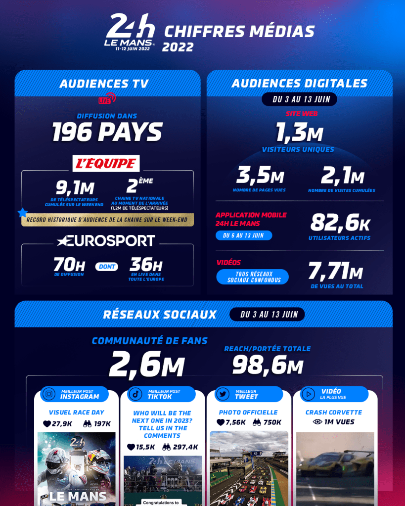 Dopo due edizioni disputate in un contesto inedito, la 24 Ore di Le Mans 2022 ha ritrovato il suo pubblico. 244.200 spettatori hanno assistito alla quinta vittoria della Toyota, mentre svariati milioni di persone hanno potuto seguire la corsa sui differenti supporti digitali. Nell’infografica che pubblichiamo di seguito potete scoprire le cifre di questa novantesima edizione della 24 Ore.