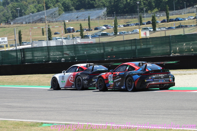 Momento decisivo di gara 2 del Mugello, dopo la seconda safety car, è stato il sorpasso che Caglioni, che a 19 anni ha riportato sul gradino più alto lo Scholarship Programme di Porsche Italia, ha ben preparato alla San Donato su Laurini. Il pilota di Dinamic Motorsport aveva mantenuto il comando fin dal via e l’aveva difeso nelle due ripartenze, ma a pochi giri dal termine ha dovuto arrendersi all’alfiere Ombra Racing, concludendo comunque secondo e riportando sul podio la squadra campione in carica fra i team. Con Quaresmini terzo, sotto al podio hanno concluso i rivali per il titolo: Malucelli, secondo in gara 1, stavolta è quarto al traguardo evitando rischi inutili, mentre il campione in carica Alberto Cerqui (Ghinzani Arco Motorsport – Centri Porsche Milano) ha rimontato da 23° a sesto dopo la penalità inflittagli sabato per jump start. Fra i due, con tanto di giro più veloce (1’52″863), si è inserito al quinto posto il sudafricano di AB Racing – Centri Porsche Roma Keagan Masters, sempre coriaceo nelle rimonte. Il recupero di alcuni piloti è stato agevolato anche dai due episodi che hanno costretto la direzione gara a impiegare la safety car. In lotta per il secondo posto, al terzo giro Benedetto Strignano, nel tentativo di superarlo, ha toccato alla Casanova-Savelli l’alfiere di BeDriver – Centro Porsche Piacenza Diego Bertonelli, che l’aveva superato allo start. Bertonelli si è fermato definitivamente nelle vie di fuga, mentre il pilota di Villorba Corse – Centro Porsche Treviso è stato penalizzato di 25 secondi, precipitando a fondo classifica. Alla ripartenza dalla prima safety car, al quinto giro un altro periodo di neutralizzazione è stato chiamato a causa di una carambola innescata da un contatto fra Aldo Festante, che stava andando all’attacco della top-5, e Giammarco Levorato. Entrambi sono stati costretti al ritiro per i danni riportati, così come Alberto De Amicis. Il leader della Michelin Cup ha dovuto scartare la vettura di Stefano Monaco (finita anch’essa in testacoda nella carambola) ed è stato colpito da un altro pilota che sopraggiungeva, con conseguente ritiro dopo il successo di classe ottenuto sabato in gara 1. Proprio nella Michelin Cup, con il capoclassifica di Ebimotors fuori dai giochi, è stato Marco Cassarà a cogliere il primo centro personale in stagione. Il campione in carica di Raptor Engineering – Centro Porsche Catania ha preceduto sul podio Luca Pastorelli (Krypton Motorsport) e Gianluca Giorgi (Ebimotors).