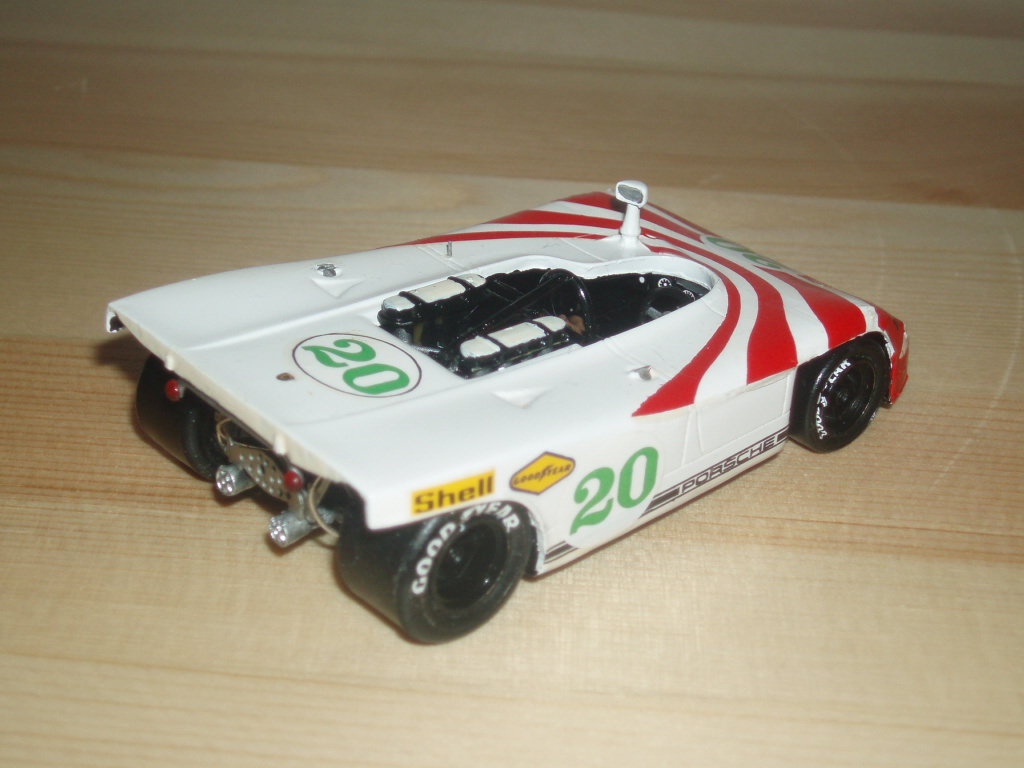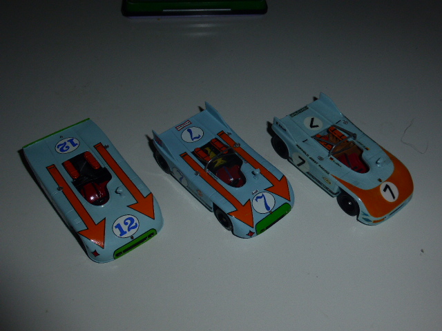 E’ come se questi tre modelli avessero un po’ rimpiazzato il vecchio kit montato nella primavera del 1987. Ricordo che la decorazione rossa mi dette parecchio filo da torcere e alla fine me la cavai sufficientemente bene raccordando i tanti “buchi” col classico rosso Humbrol numero 19. Dettagliai in qualche modo anche il posteriore, aggiungendo alcuni cavetti, tubicini e un paio di elementi del telaio, al limite della casualità. Oggi, dicevo, mi restano questi altri tre modelli: della numero 12 ho già parlato, gli altri sono la numero 7 della Targa Florio 1971 e la vettura di Joest della 1000km di Monza 1972. Sulle due della Targa, il montatore aveva scambiato un elemento centrale circolare del motore per un faretto unico, tipo Formula 1! In realtà queste vetture avevano due luci circolari, assenti nel kit, se non ricordo male.