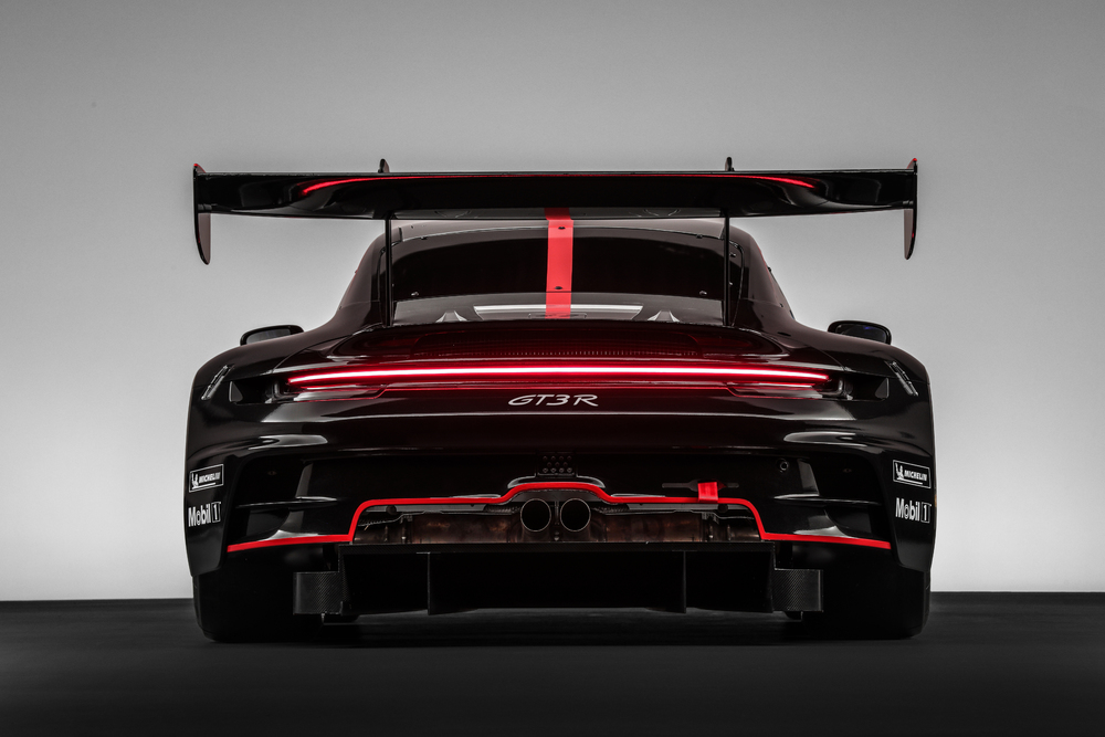 La nuova 911 GT3 R è solo la seconda vettura da corsa di Porsche Motorsport basata sull’attuale generazione 992 della 911, dopo la 911 GT3 Cup. La sua carrozzeria leggera caratterizzata da un intelligente design in composito di alluminio e acciaio si ispira al modello di serie, sebbene con importanti modifiche ai fini di un utilizzo per la 911 GT3 R. Quasi tutti i componenti della carrozzeria sono realizzati in carbonio leggero, compresi i cofani anteriori e posteriori, le portiere, i pannelli laterali, l’alettone posteriore e il tetto. I passaruota sono stati realizzati in fibre aramidiche.