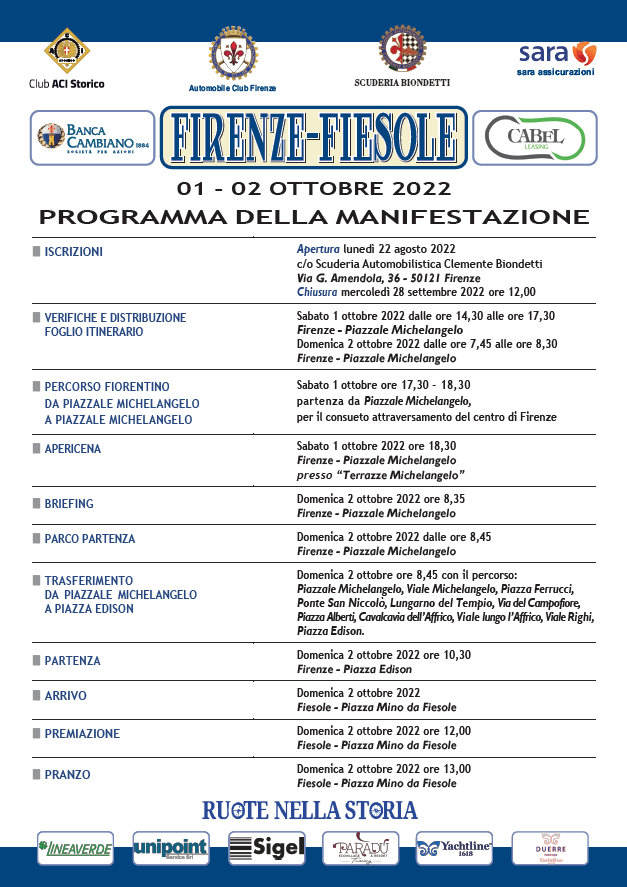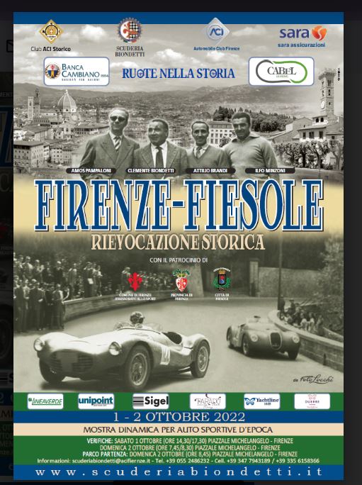Torna dopo due anni di interruzione la Firenze-Fiesole, rievocazione non competitiva della gara che si tenne nel dopoguerra. Alla manifestazione sono attese interessanti vetture, al netto della sempre simpatica atmosfera che regna nella stragrande maggioranza delle manifestazioni toscane. Qui di seguito trovate il programma delle due giornate.
