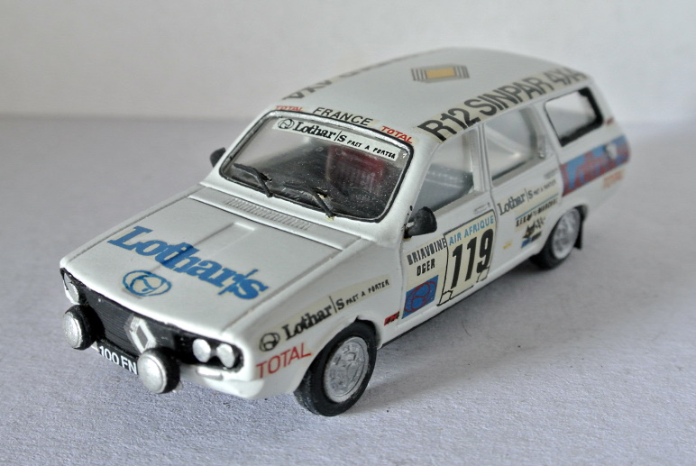 “Il terzo, n. 503 sempre del 1977 e sempre 4500 £, è la citata versione corsaiola della R12 break. Si tratta della celeberrima Sinpar 4×4 che vinse il Côte d’Ivoire-Côte d’Azur del 1976-77 con Jean-Claude Briavoine e Alain Ogier. L’originale fu purtroppo ritoccata, come usava allora (ci mancherebbe, non c’è mica nulla di strano, anzi. Sarebbe assurdo metterci delle fotoincisioni o roba del genere n.d.r.)”.