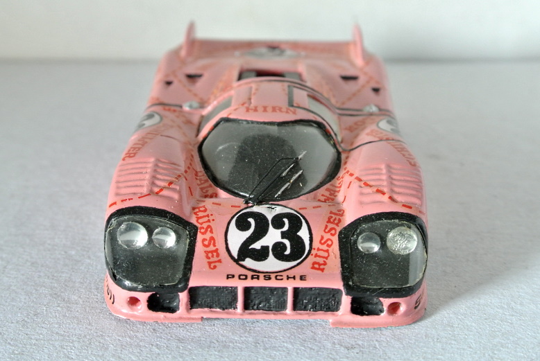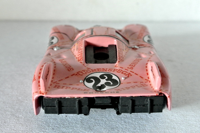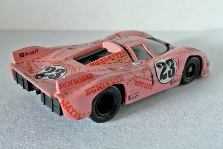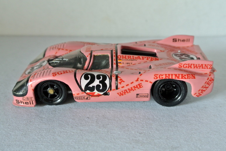 E per finire, non un transkit ma un kit, sempre Mini Racing: “Concludo – scrive Marco – con l’unico kit Mini Racing della mia collezione. Dovrebbe essere il n. 2B del 1976, ma quando apparve la prima volta sul TSSK aveva il n. 1. Il n. 2 era la Simca CG Proto. E’ la famosa maialino rosa di Le Mans 1971. Rifeci o aggiunsi alcuni dettagli, come i fari (i due blocchi originali di resina giallastra erano terribili…), il tergi e i faretti di illuminazione dei numeri di gara. Il retro è abbozzato. All’epoca la documentazione scarseggiava e andai di nero opaco. Il rosa è una mistura di rosso e bianco Humbrol steso a pennello. Di bombolette rosa neanche l’ombra, almeno dalle mie parti”.