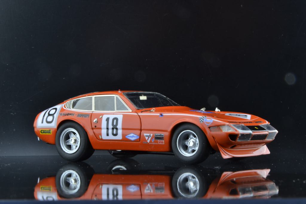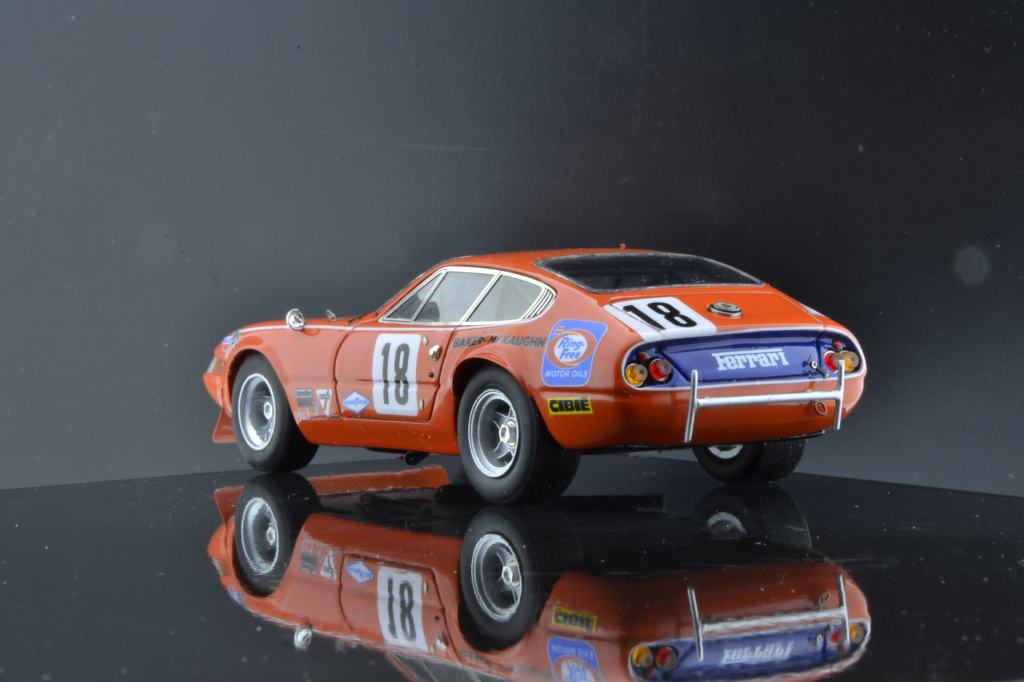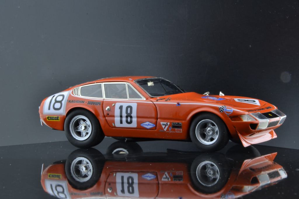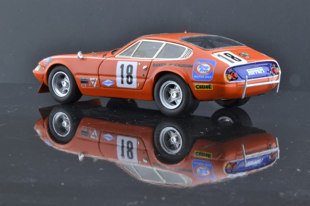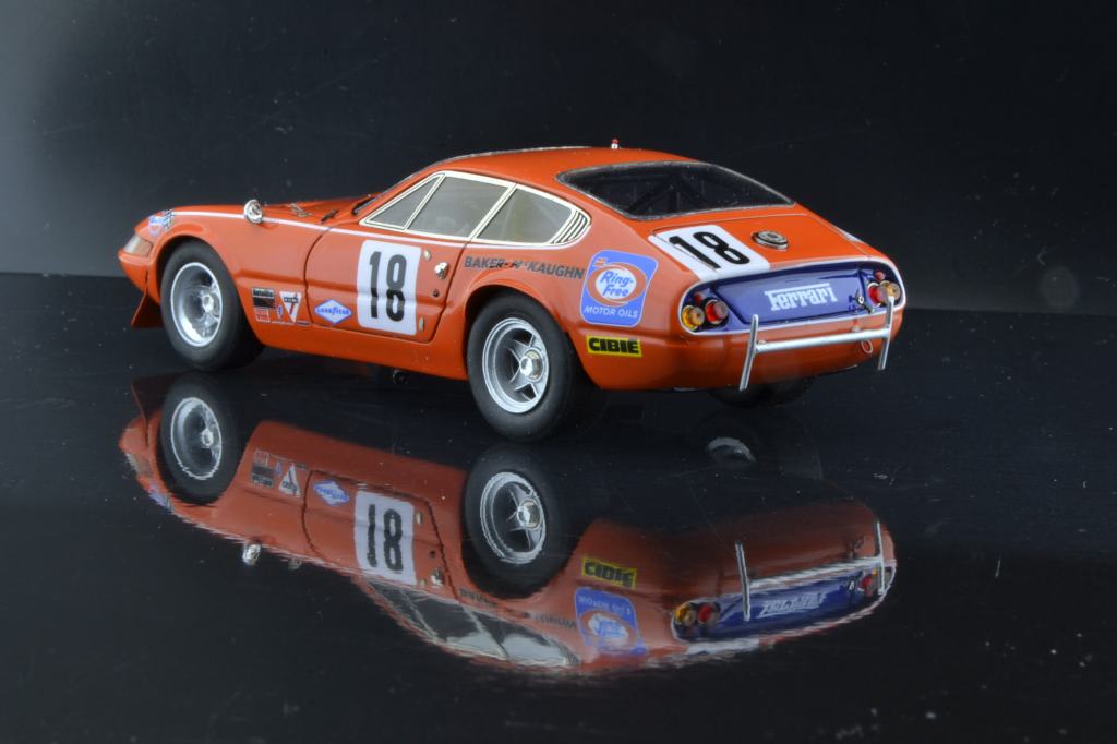 La Ferrari 365 GTB/4 Daytona telaio numero 12467 non fa parte delle tre serie speciali approntate direttamente dalla Casa per i clienti sportivi. La vettura, di proprietà del NART, concluse al quinto posto a Le Mans nel 1971 con “Coco” Chinetti e Bob Grossman. Successivamente venne venduta alla Baker Motors, che sotto il nome di Ring Free Oil Team (Atlanta, Georgia) l’impiegò in gare americane come la 12 Ore di Sebring 1972 dove Harry Ingle e Charles Reynolds ottennero un 5° posto di classe GTO e 19° assoluto. Presentiamo un montaggio di Gualtiero Negri su kit BBR (resina, 1:43) e decals artigianali.