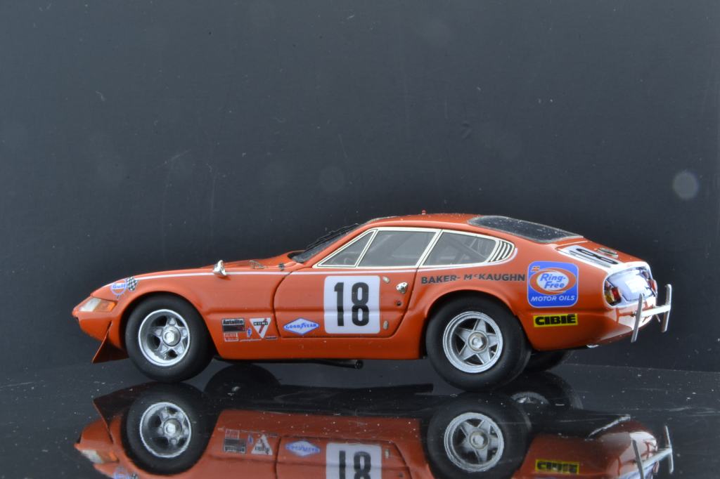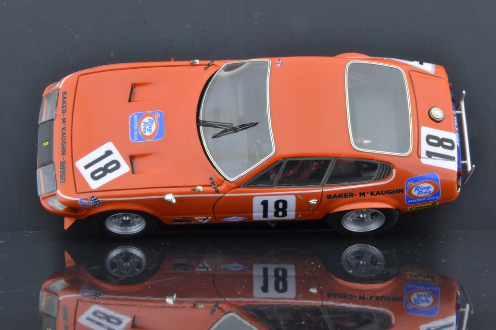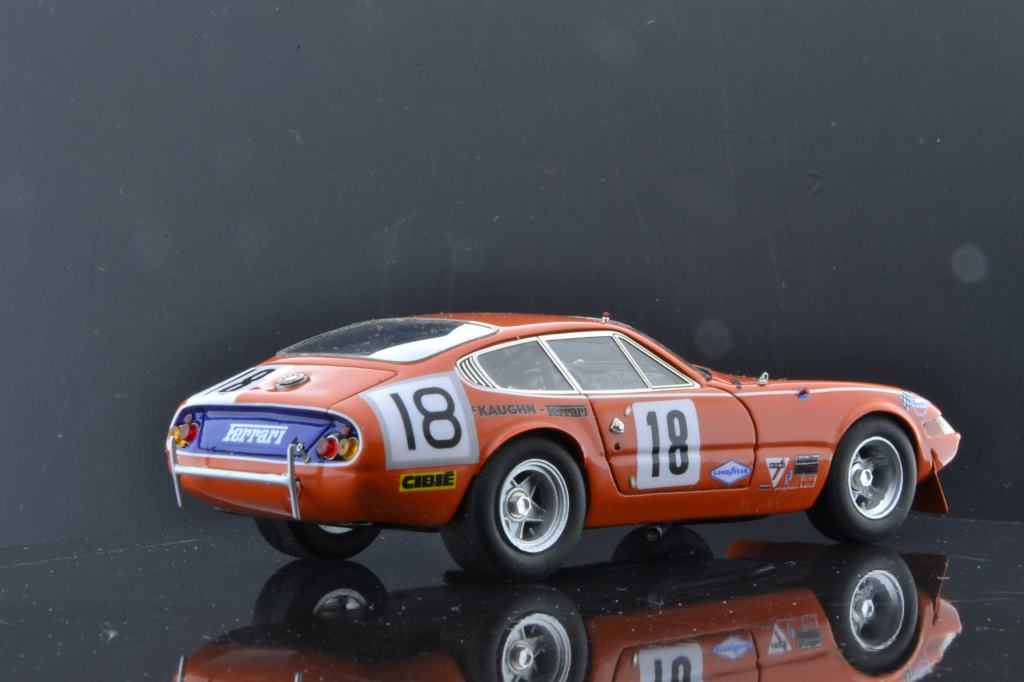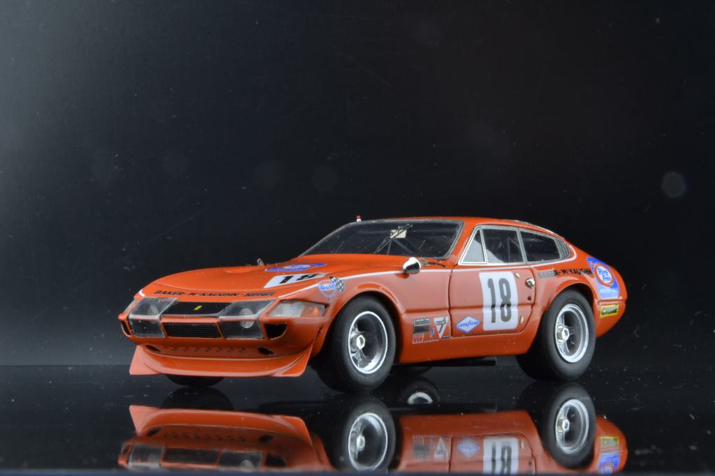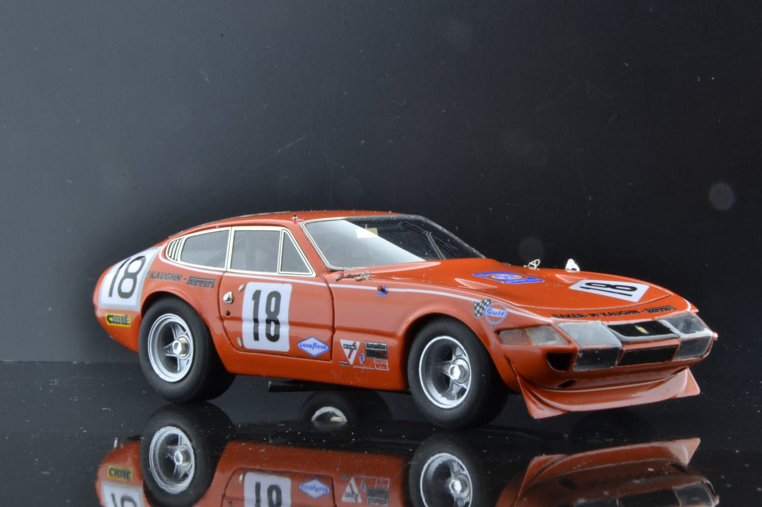 La Ferrari 365 GTB/4 Daytona telaio numero 12467 non fa parte delle tre serie speciali approntate direttamente dalla Casa per i clienti sportivi. La vettura, di proprietà del NART, concluse al quinto posto a Le Mans nel 1971 con “Coco” Chinetti e Bob Grossman. Successivamente venne venduta alla Baker Motors, che sotto il nome di Ring Free Oil Team (Atlanta, Georgia) l’impiegò in gare americane come la 12 Ore di Sebring 1972 dove Harry Ingle e Charles Reynolds ottennero un 5° posto di classe GTO e 19° assoluto. Presentiamo un montaggio di Gualtiero Negri su kit BBR (resina, 1:43) e decals artigianali.