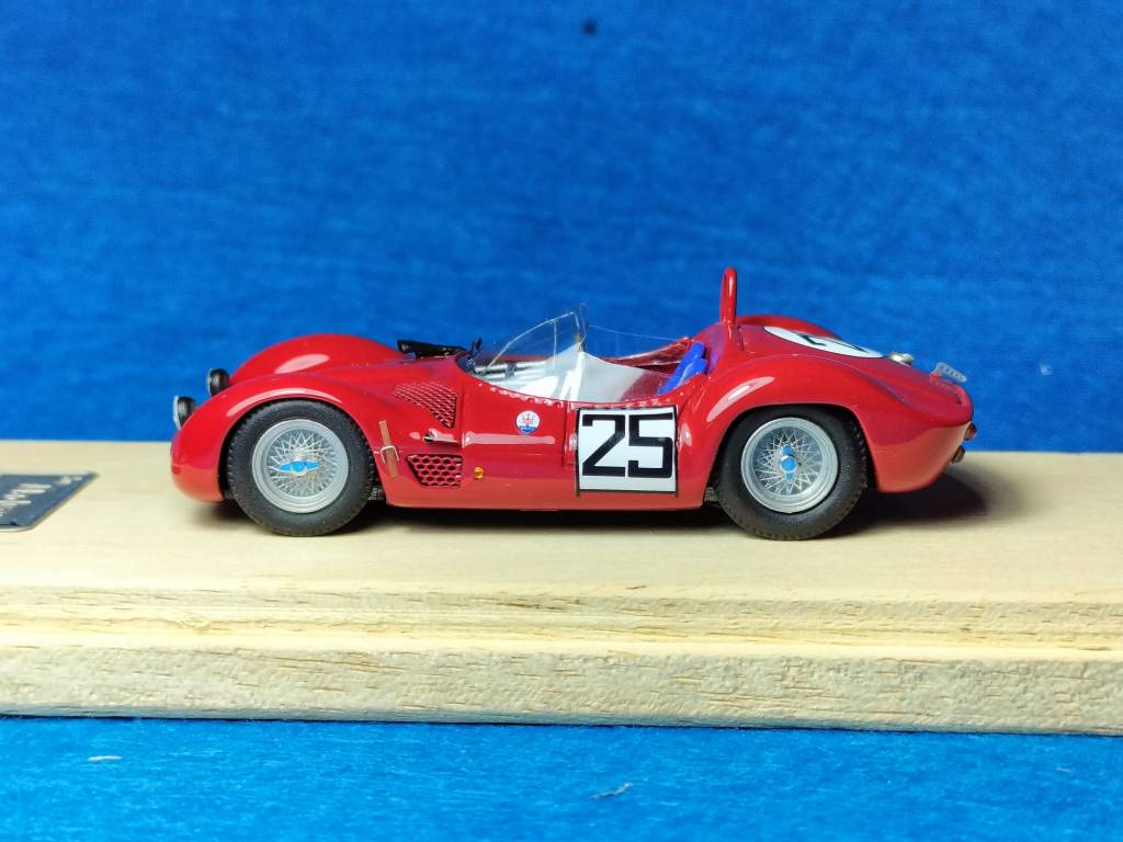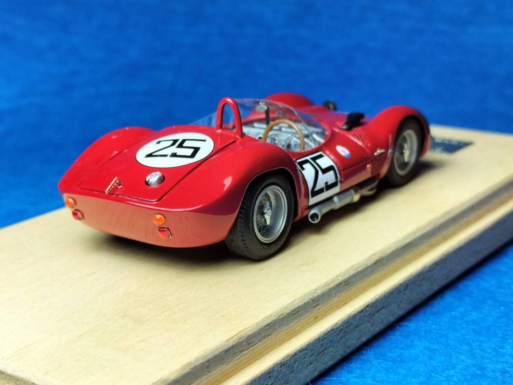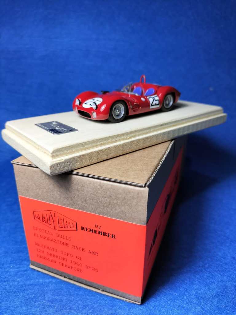 Tre esemplari numerati singolarmente ed elaborati da kit originale X-AMR: è la più recente serie montata di Madyero, che di tanto in tanto si dedica anche a kit rari per realizzare versioni inedite. Stavolta si tratta della Maserati Tipo 61 Birdcage che venne iscritta alla 12 Ore di Sebring 1960 dal Jaguar District of NY di Woodside (New York) per Walt Hansgen e Ed Crawford. La vettura dovette ritirarsi dopo aver coperto 149 giri. Il kit AMR è stato accuratamente elaborato, con l’aggiunta di dettagli specifici. Particolare attenzione è stata posta nei numerosi particolari come ganci fermacofano, leva del cambio, fari oltre all’intricata struttura del telaio. Molto realistico l’assetto, col modello montato su una base di legno e tenuto alla giusta distanza da terra mediante distanziali. Il modello è reperibile al seguente link: https://www.geminimodelcars.com/listing/1305259473/maserati-tipo-61-birdcage-12h-sebring