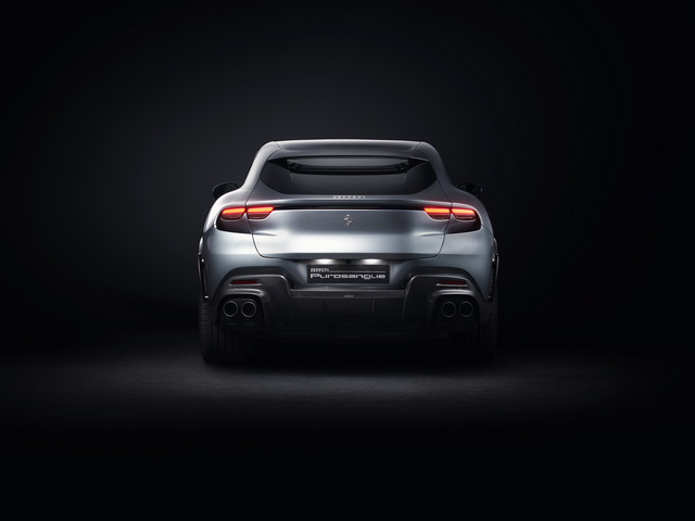 Le fiancate sono caratterizzate da un passaggio d’aria sotto il cofango che corre lateralmente, delineando il tema principale di stile, e genera un diedro che termina sui poderosi muscoli posteriori. Gli archi ruota al di sotto dei parafanghi svelano la seconda pelle della Ferrari Purosangue: gli elementi funzionali e tecnici vengono colti in seconda lettura e l’auto viene così percepita quasi come un coupé sospeso. L’apertura a libro delle porte fa percepire dall’esterno un volume interno molto grande rispetto a quello intuibile a vettura chiusa, grazie al meticoloso lavoro di contenimento delle proporzioni del padiglione.