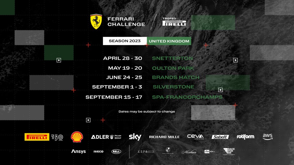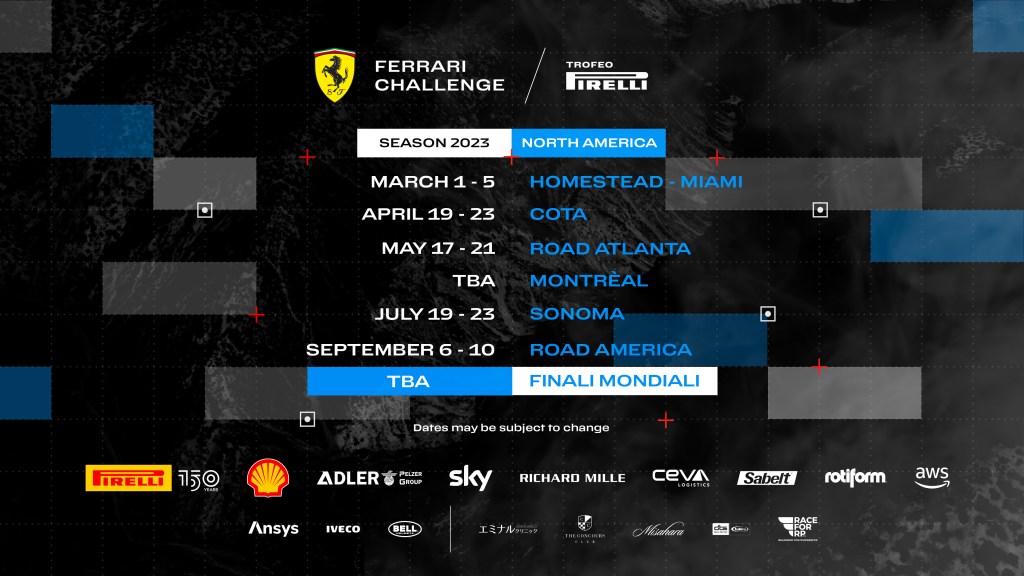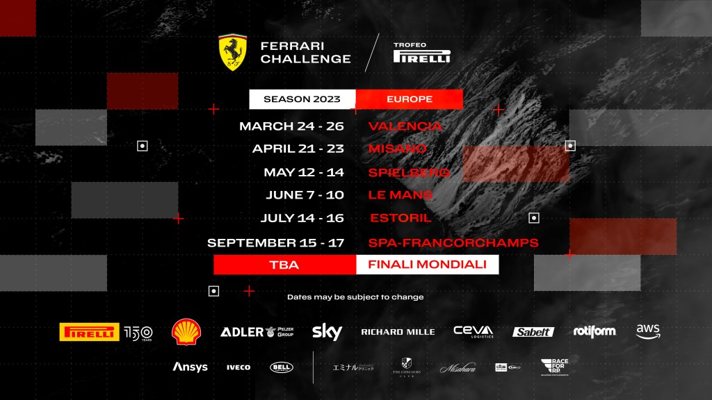 Sono stati annunciati oggi i calendari 2023 dei Ferrari Challenge. Replicando un’iniziativa che nel 2021 ha ottenuto un ottimo successo, si inizierà negli Emirati Arabi Uniti con i due appuntamenti della Winter Series a Dubai, il 27-29 gennaio e il 3-5 febbraio, in concomitanza con le due date finali del Ferrari Challenge APAC. Qui sotto il dettaglio delle varie serie.