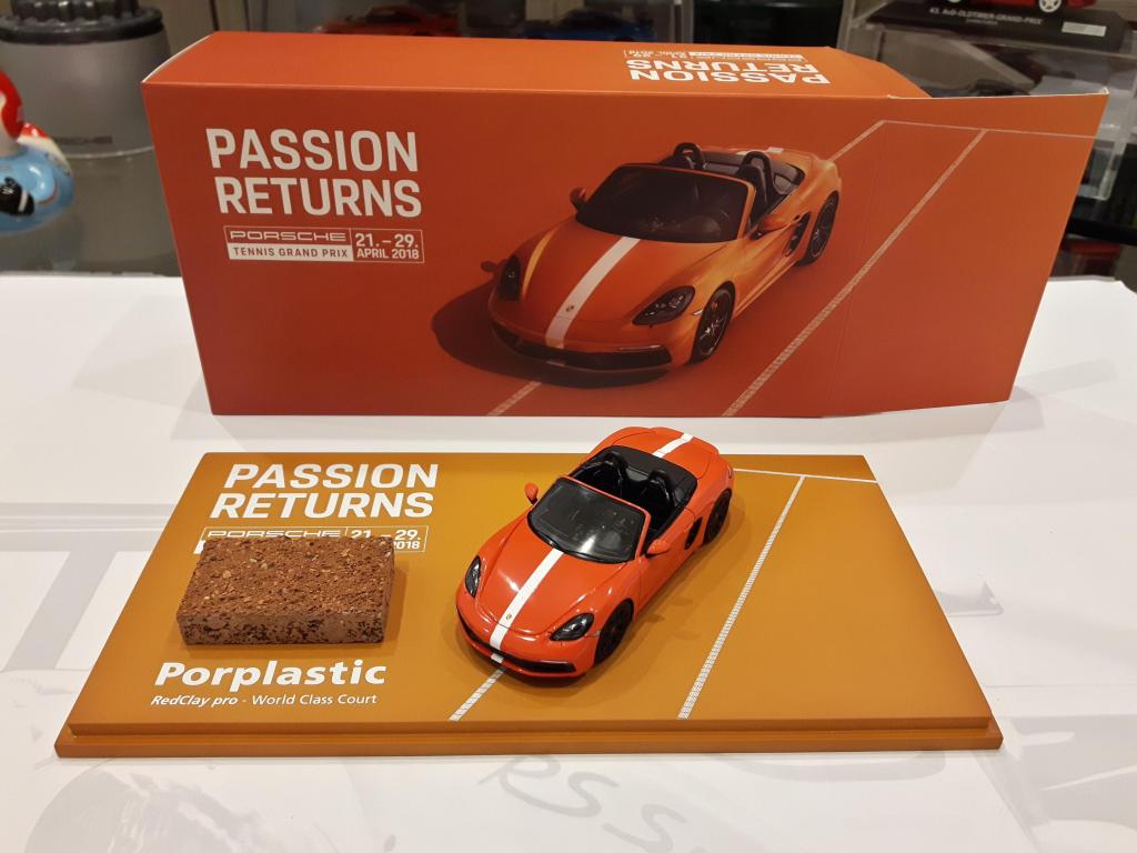 Nel 2018 Spark ha realizzato un altro bellissimo modello, una Porsche 718 Boxster GTS arancione con striscia longitudinale bianca, poggiato su una bella basetta in tinta con un tassello del campo di gioco del Porsche Arena realizzato dalla Porplastic, una ditta specializzata in pavimenti sportivi, superfici per parchi giochi, campi da tennis e sistemi in erba sintetica.