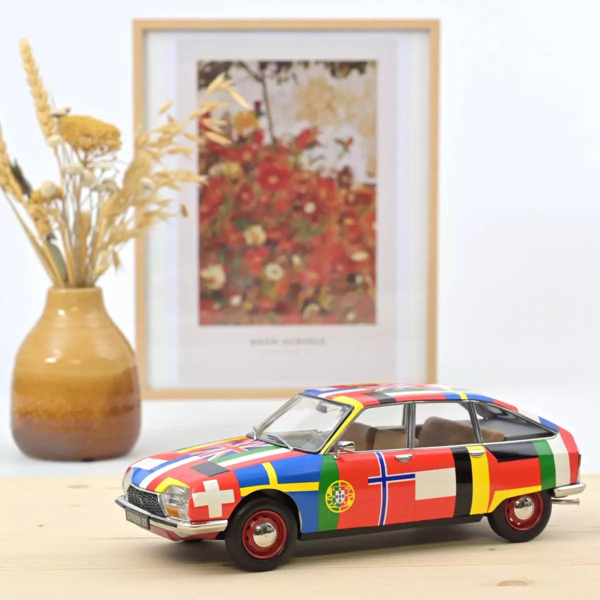 L’uscita di un nuovo stampo 1:18, quello della Citroën GS, ha invogliato Norev a produrre due edizioni esclusive per il sito, entrambe in serie limitata. Da domani 7 ottobre alle 12 sarà messa in vendita una coloratissima versione, che si riferisce alla vettura utilizzata nel 1971 in occasione del lancio commerciale, decorata con le dodici bandiere dei paesi che all’epoca componevano l’unione europea. La vettura venne esposta nel corso dei mesi con diverse combinazioni delle bandiere sulle fiancate: la miniatura Norev riproduce la primissima configurazione. Il modello, codice 181666, è in edizione limitata a 200 esemplari numerati. In 300 esempari è invece prodotta la seconda GS “exclu web”, codice 181668, in un elegante rosso Rio. Ogni modello ha un prezzo di € 69,90.