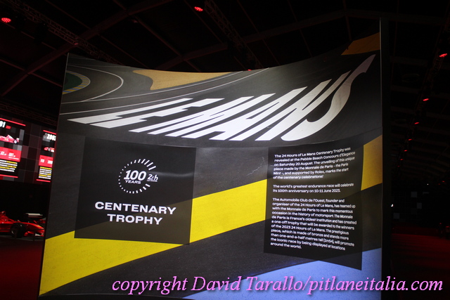 Il trofeo del centenario della 24 Ore di Le Mans (di cui leggete qui: https://pitlaneitalia.com/2022/08/20/presentato-il-trofeo-del-centenario-della-24-ore-di-le-mans/ ) è esposto nel padiglione riservato alle vetture storiche, nel paddock delle Finali Mondiali Ferrari a Imola. Il trofeo continuerà poi il suo lungo giro, prima di arrivare a Le Mans nei giorni della 24 Ore ed essere assegnato al vincitore dell’edizione 2023, che si preannuncia memorabile.